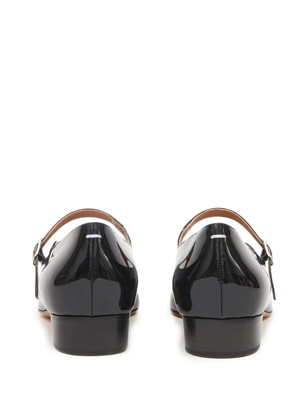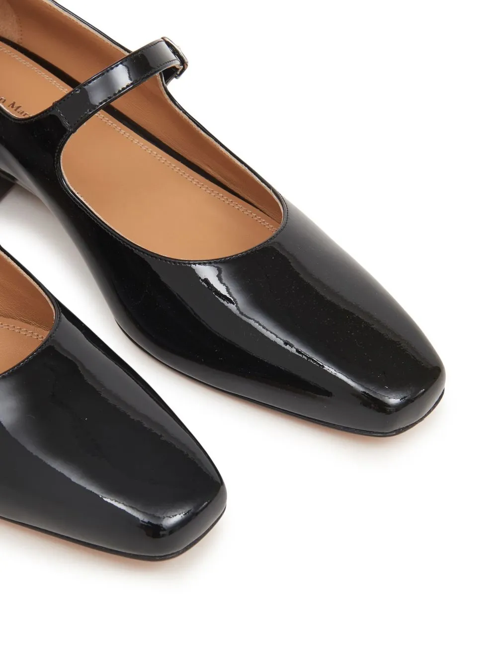 Noir, cuir de veau, fini verni, bout en amande, fermeture bride à boucle, petit talon.