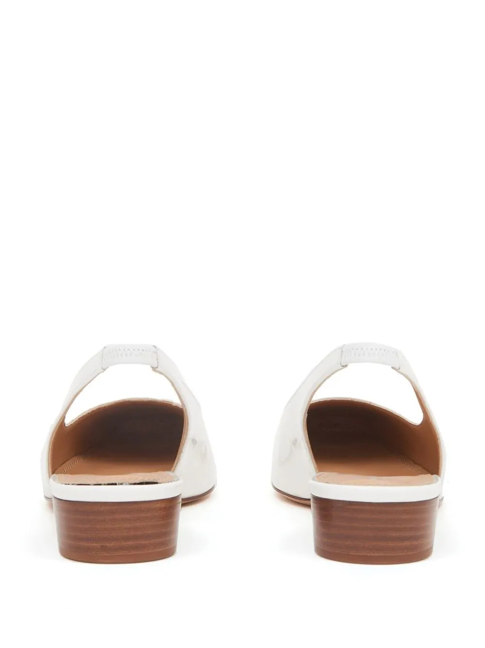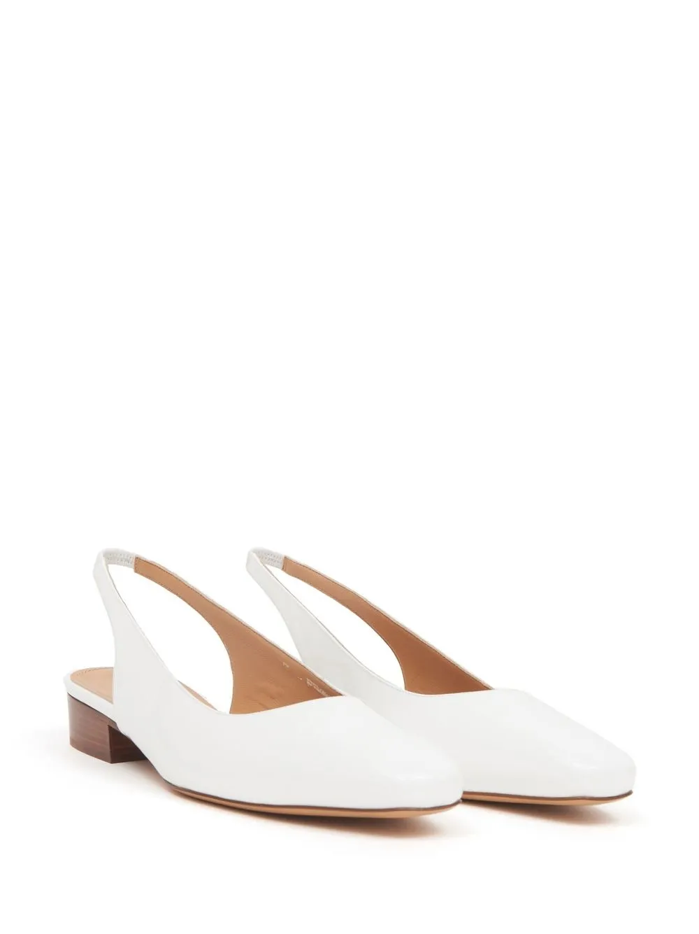 Blanc, cuir de veau, fini verni, bout en amande, petit talon, design à enfiler.