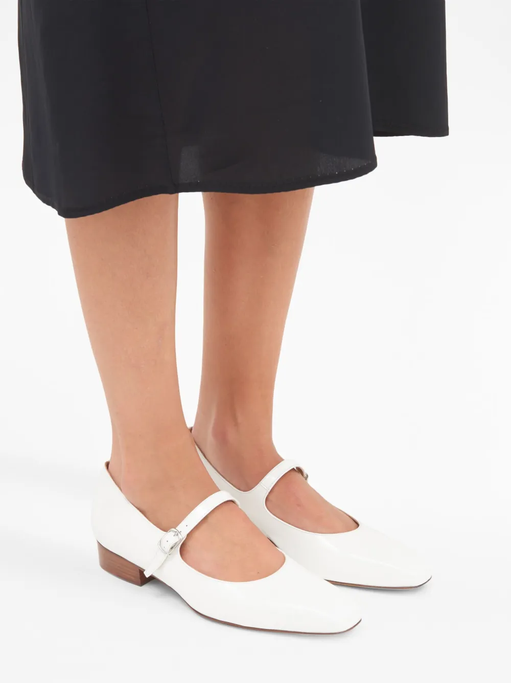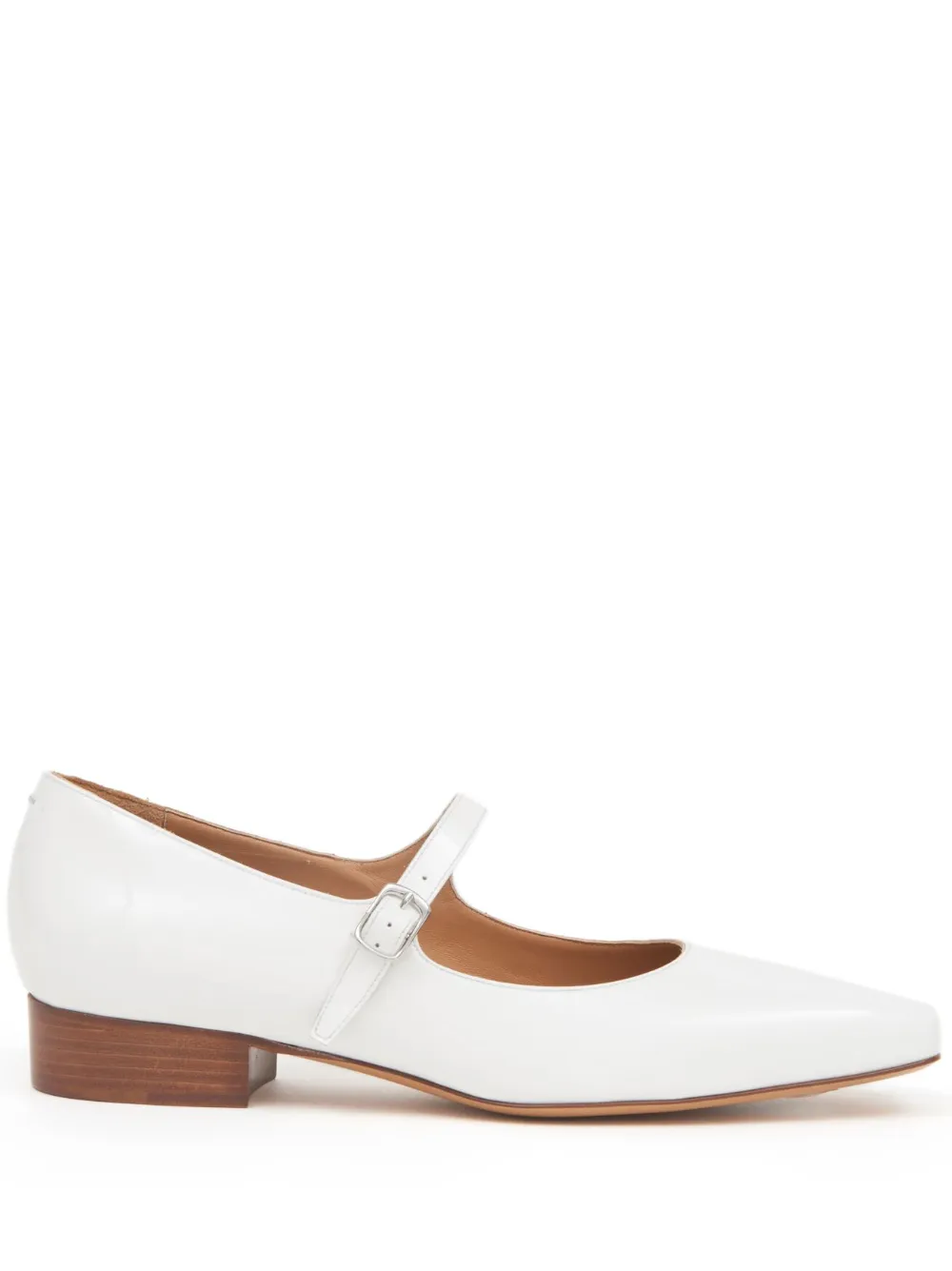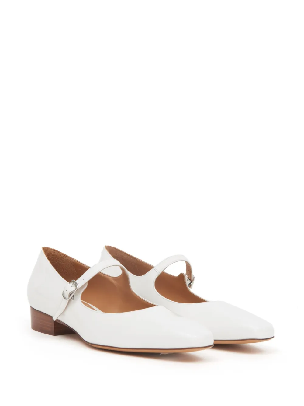 Blanc ivoire, cuir, bout carré, fermeture à boucles sur les côtés, semelle intérieure à logo, semelle en cuir.