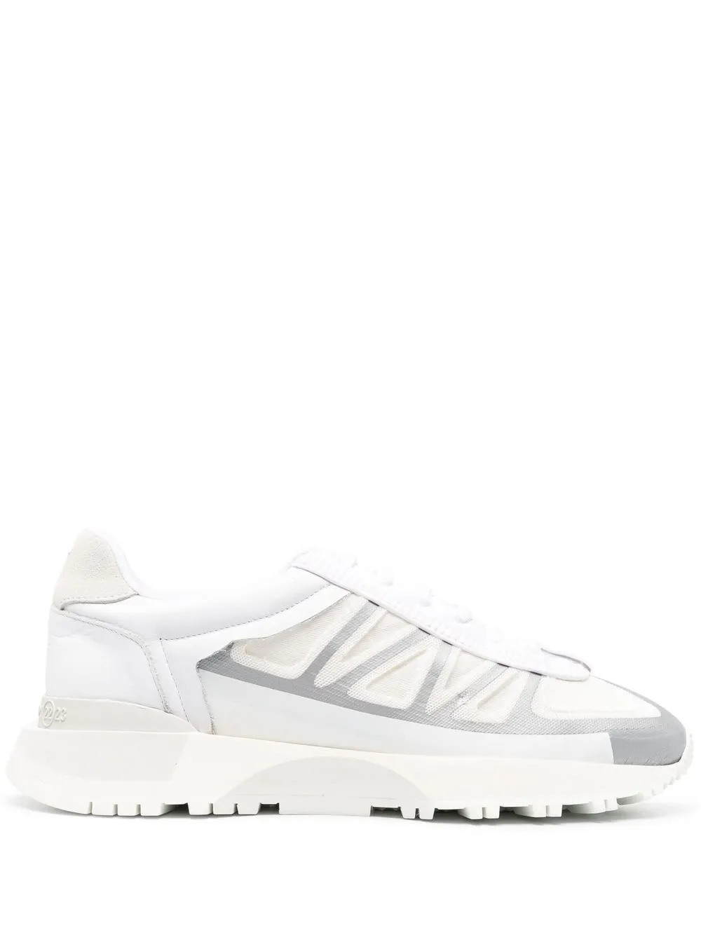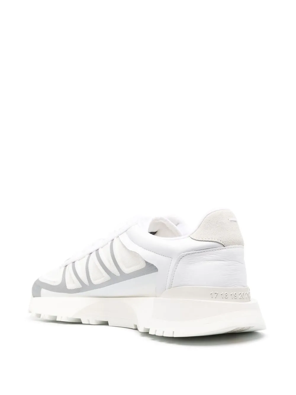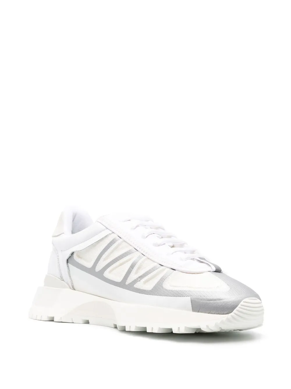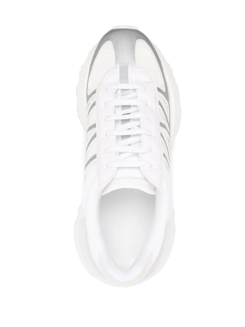 Blanc, gris, cuir de veau, logo embossé au dos, détail de rayure latérale, bout rond, fermeture à lacer sur le devant, semelle intérieure à logo, semelle plate en caoutchouc.