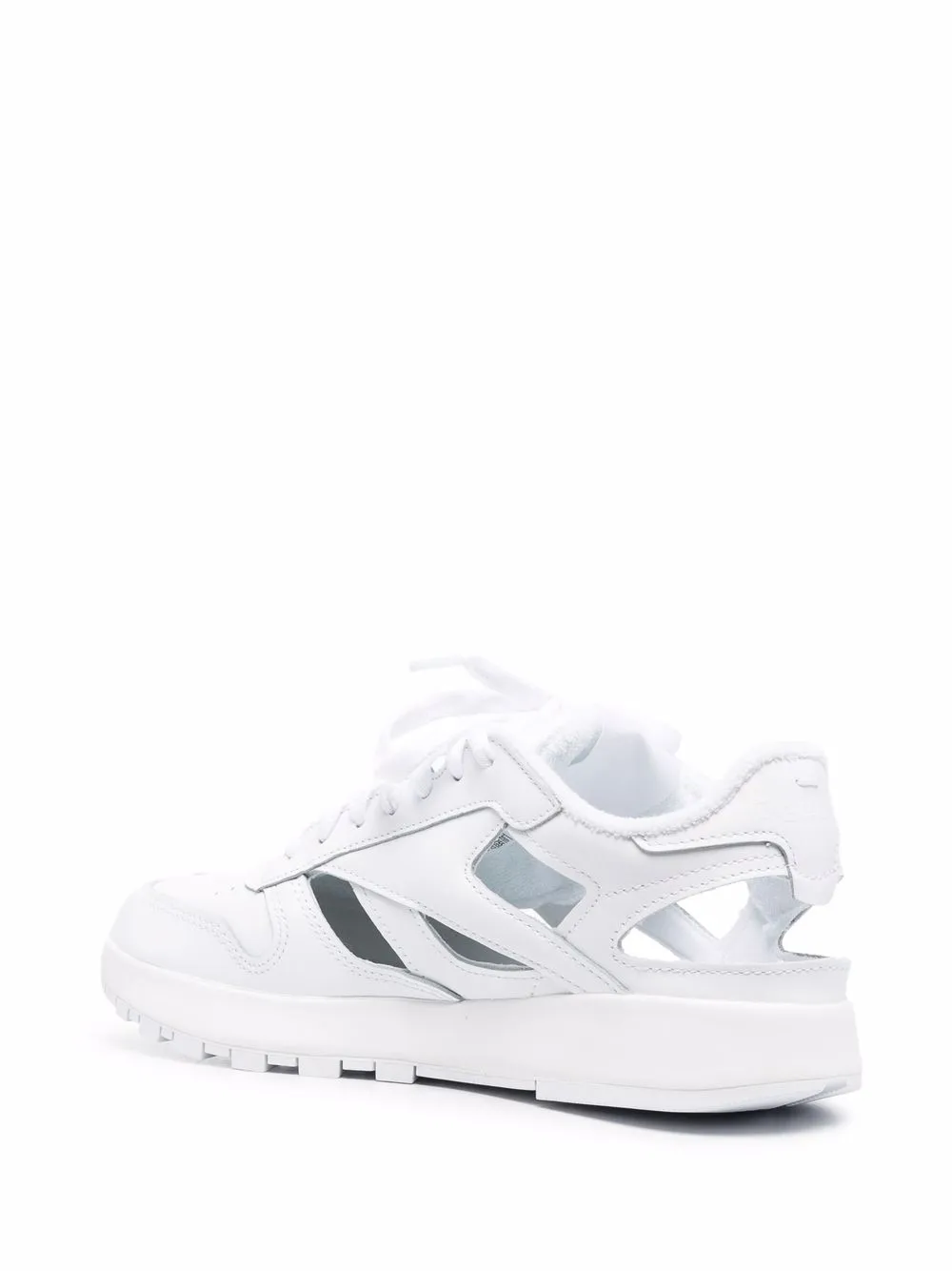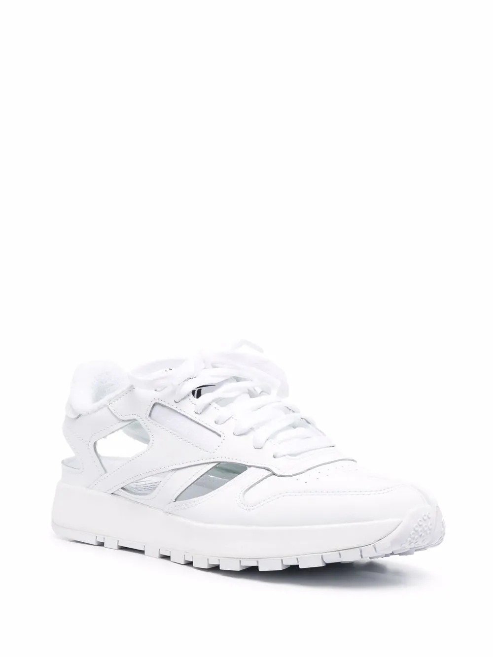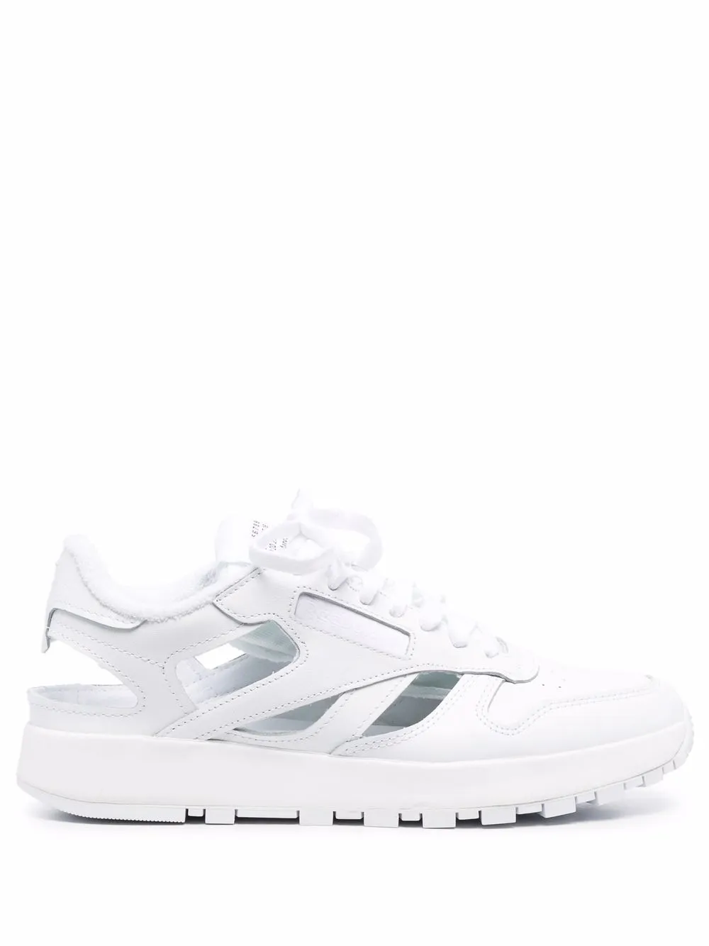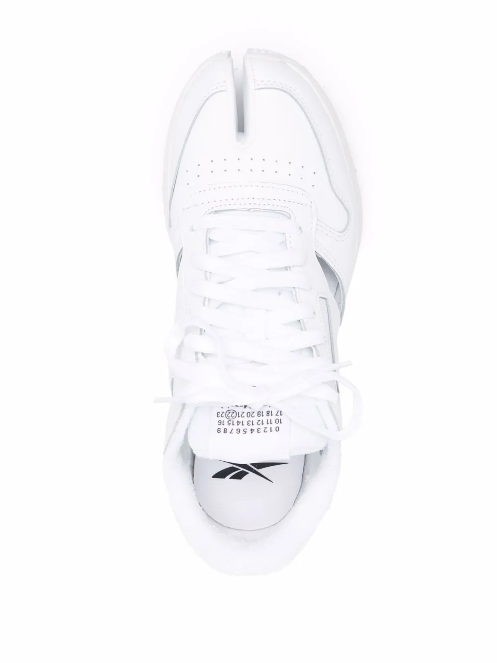 Détails de découpes, languette à patch logo, bout Tabi signature, fermeture à lacer sur le devant, semelle intérieure à logo, semelle plate en caoutchouc. Couleur : blanc. Matière : cuir.