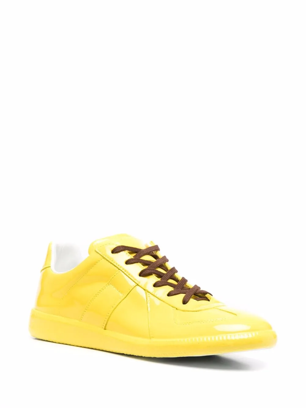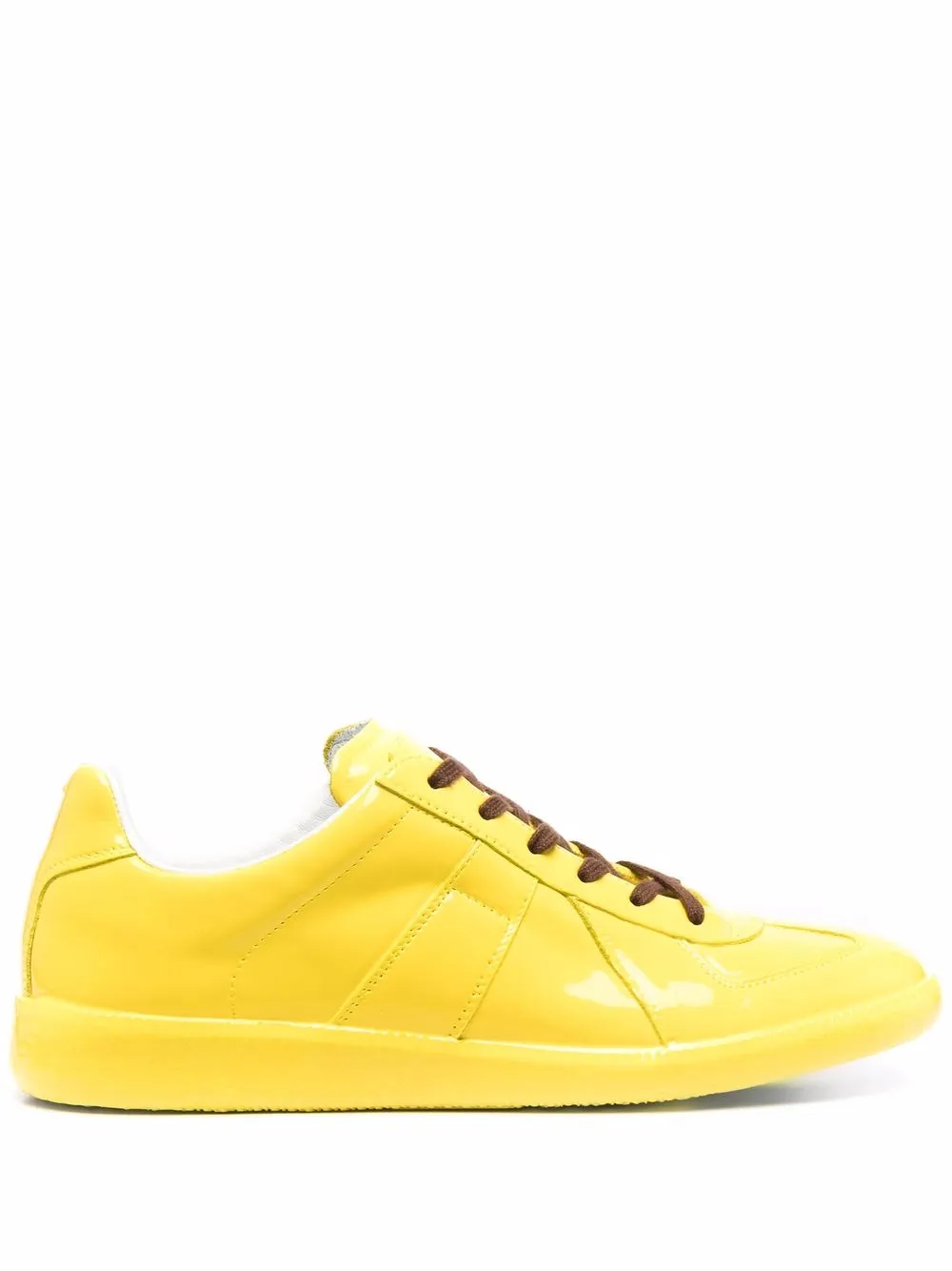 Fini brillant, bout rond, fermeture à lacer sur le devant, semelle intérieure à logo, semelle plate en caoutchouc. Couleur : jaune. Matière : cuir.