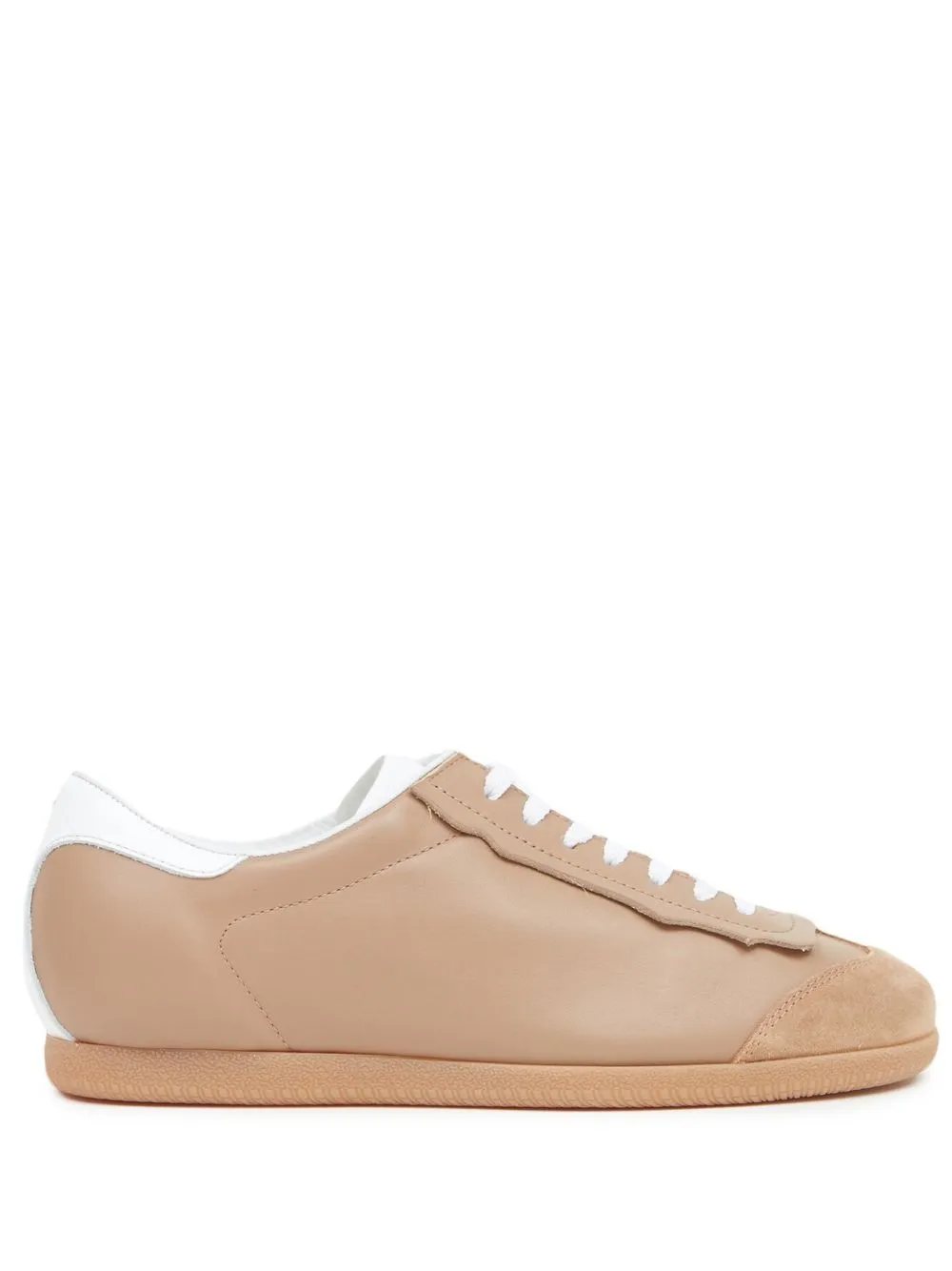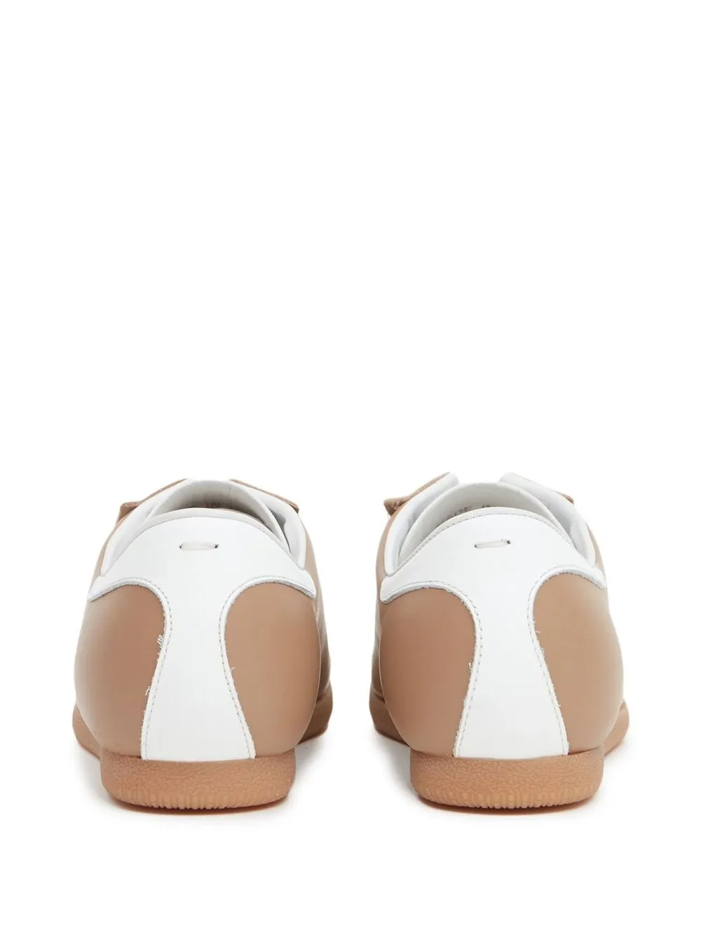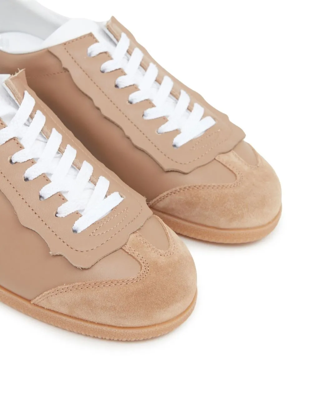 Marron camel, blanc, cuir de veau, modèle bicolore, bout rond, fermeture à lacer sur le devant, semelle plate en caoutchouc.
