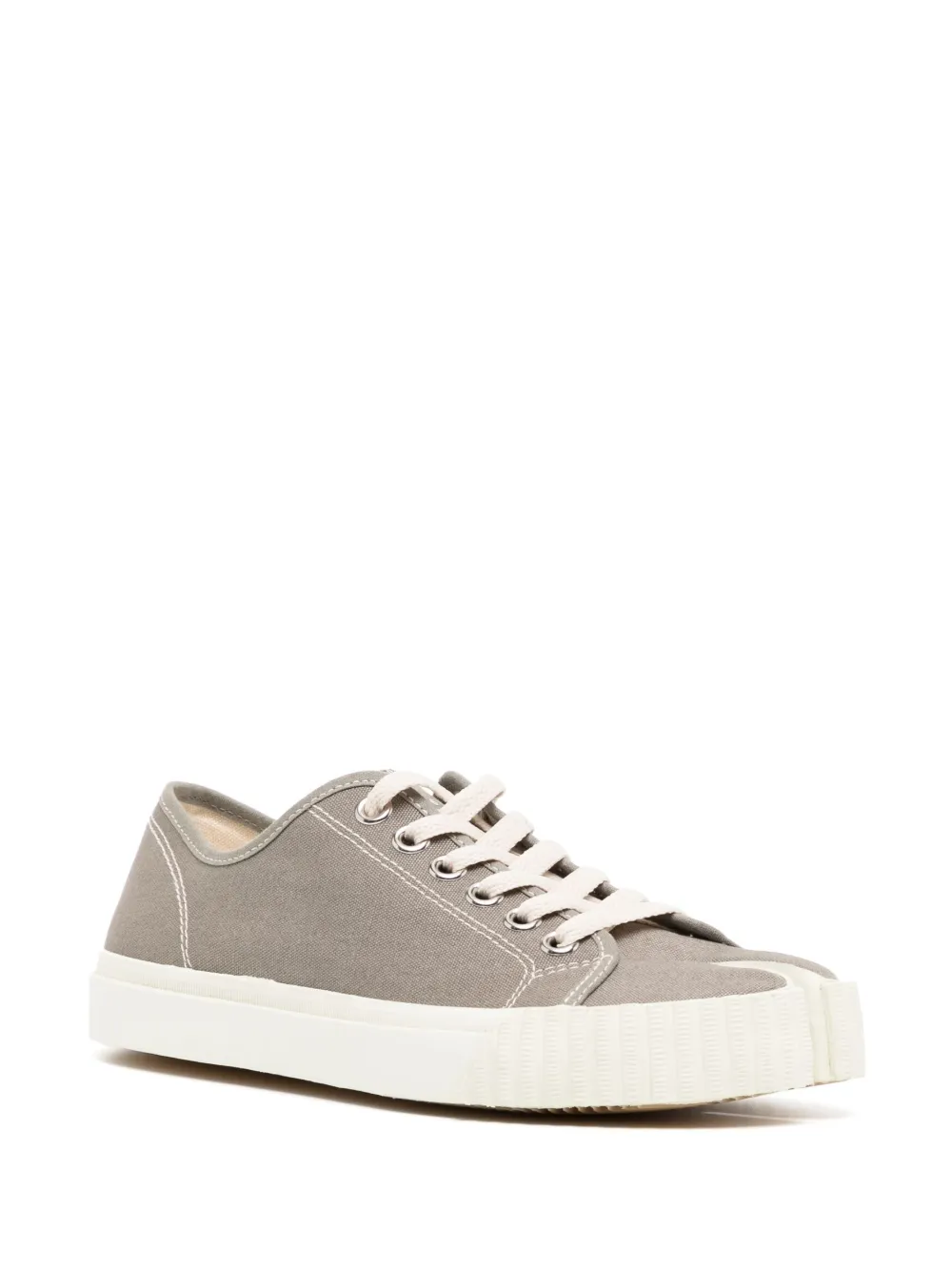 Gris taupe, logo numéroté signature, bout Tabi signature, logo à point unique signature , détails d’œillets, fermeture à lacer sur le devant, semelle plate en caoutchouc.
