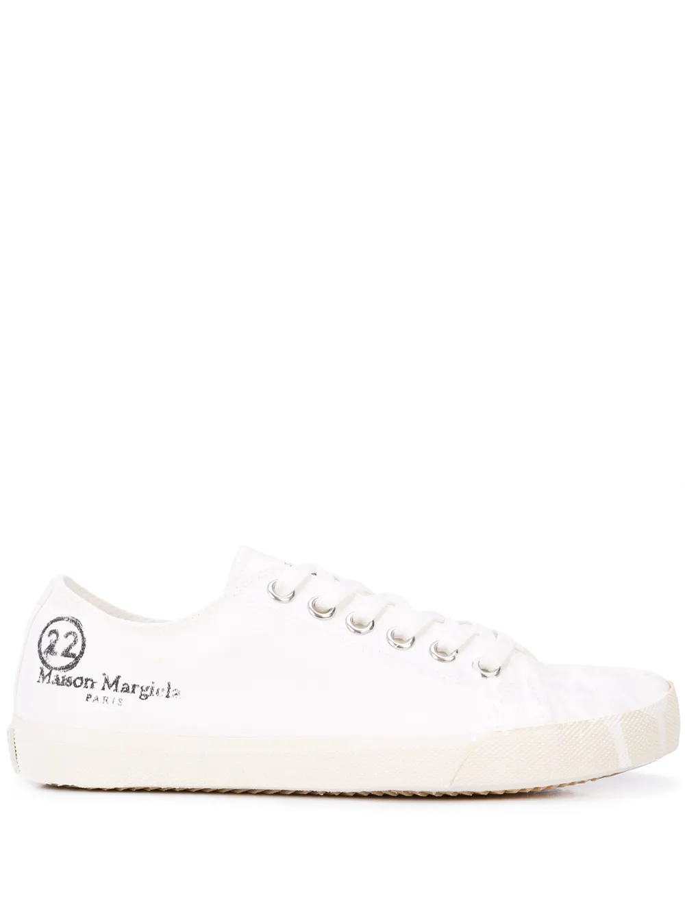 Baskets Tabi à effet taches de peinture Maison Margiela avec fermeture à lacer sur le devant, patch logo sur la languette, bout contrastant, semelle plate en caoutchouc, logo à l’extérieur, monogramme sur le talon et design à œillets. Couleur : blanc.