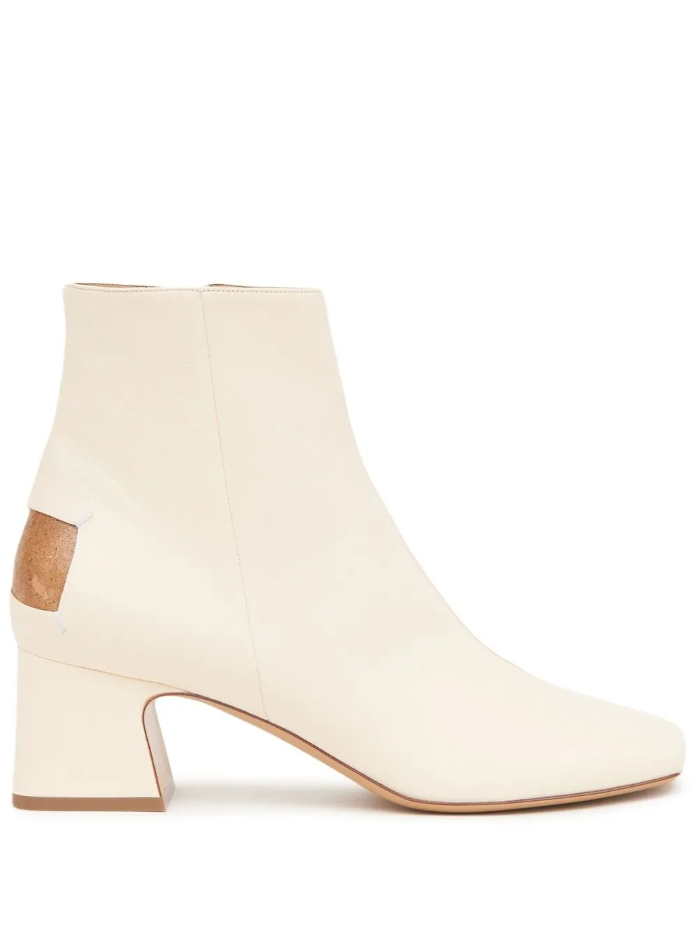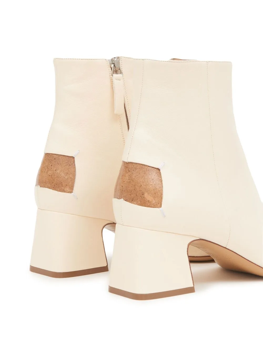 Blanc crème, cuir de veau, contrefort contrastant, bout carré, talon mi-haut épais, fermeture zippée sur le côté, hauteur cheville.