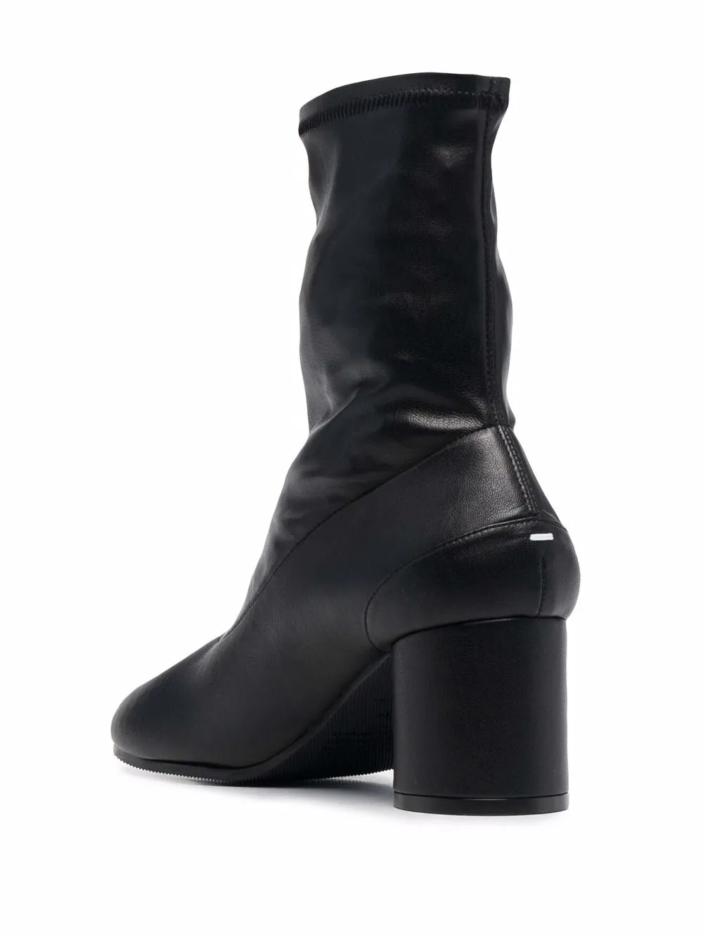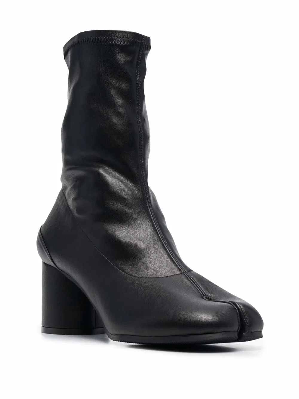 Bout Tabi signature, cheville style chaussette, talon mi-haut épais. Couleur : noir. Matière : cuir artificiel.