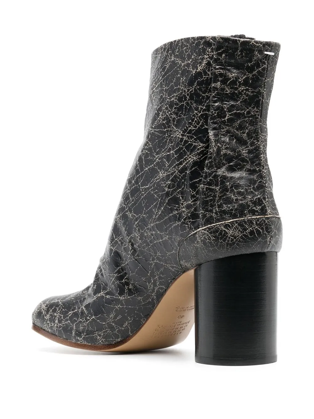 Noir/blanc, cuir de veau, hauteur cheville, bout Tabi signature, fermeture zippée dissimulée sur le côté, semelle intérieure à logo, talon mi-haut épais.