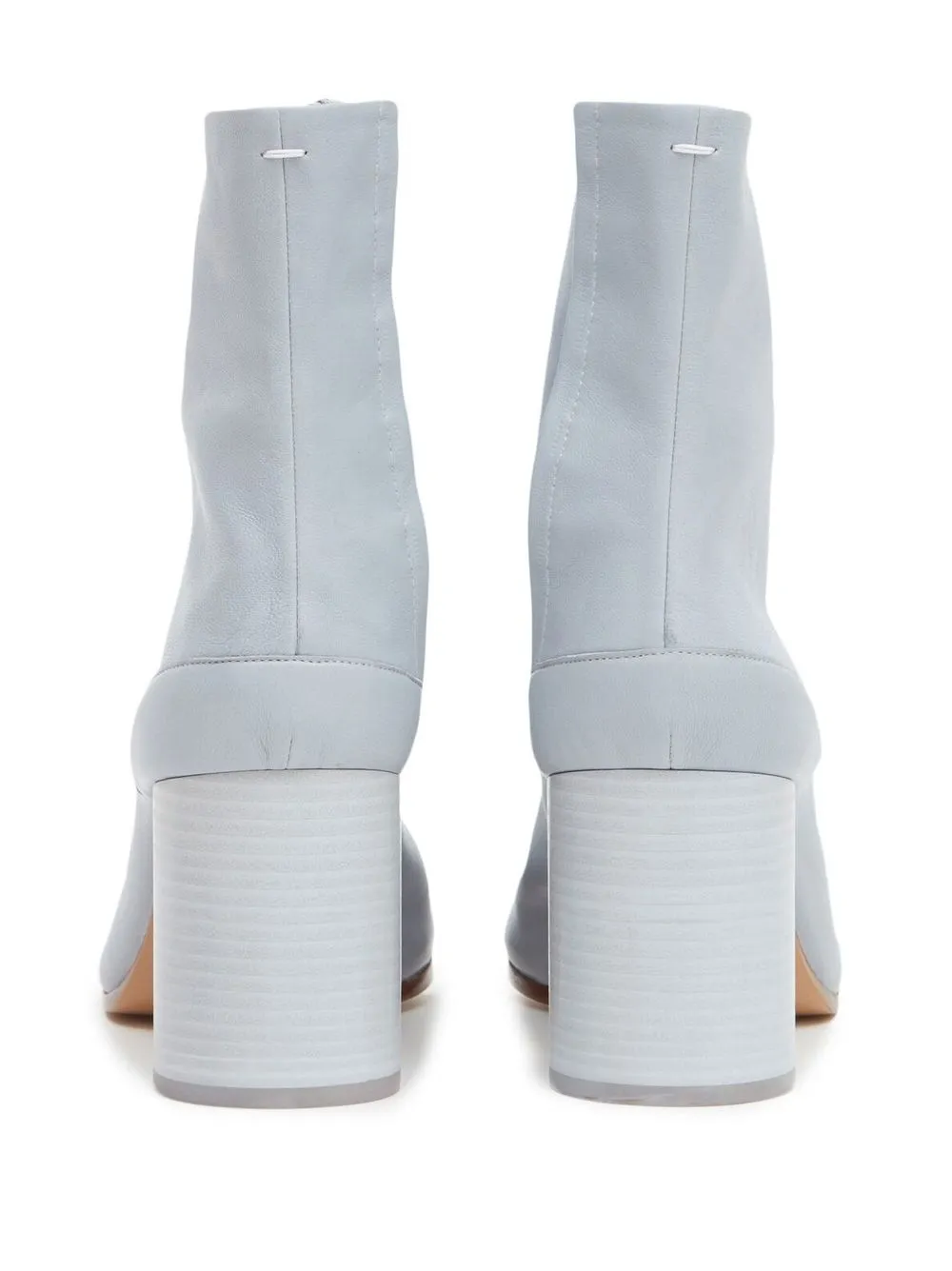 Bleu ciel, peau d’agneau, bout Tabi signature, hauteur cheville, contrefort à logo, talon haut épais.