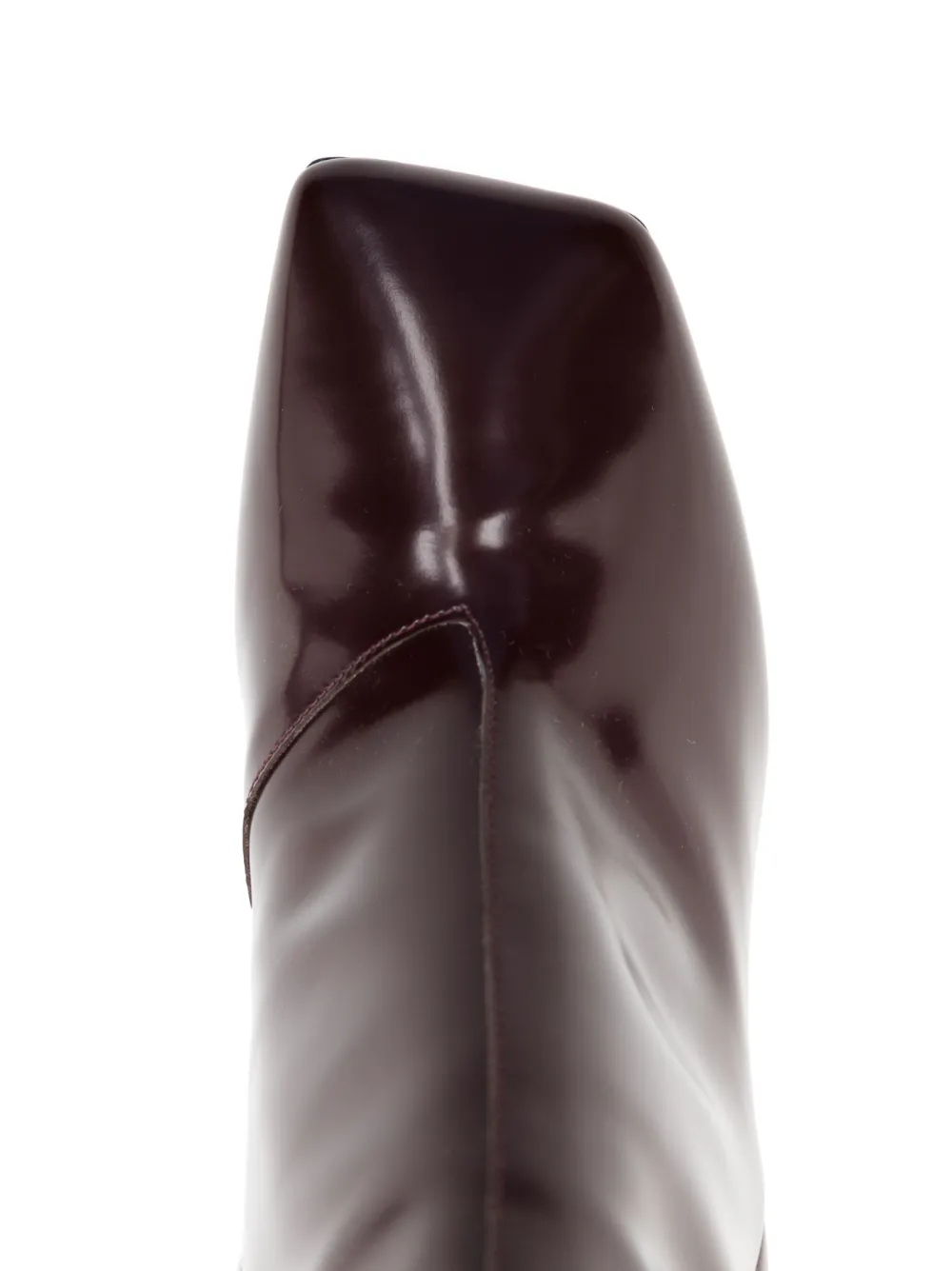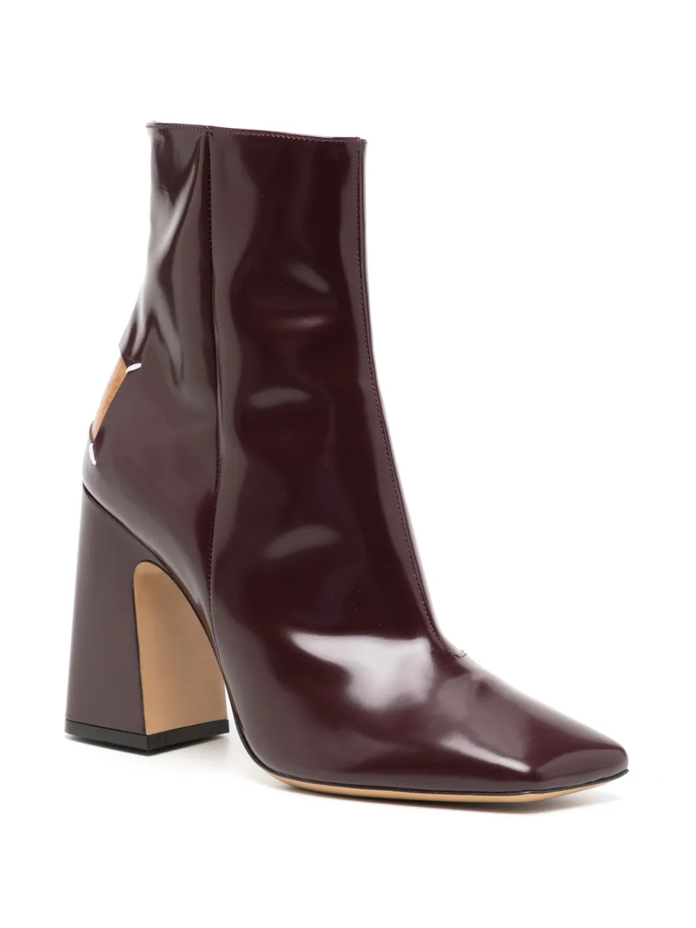 rouge bordeaux, cuir, contrefort contrastant, bout carré, hauteur cheville, fermeture zippée sur les côtés, talon haut épais.