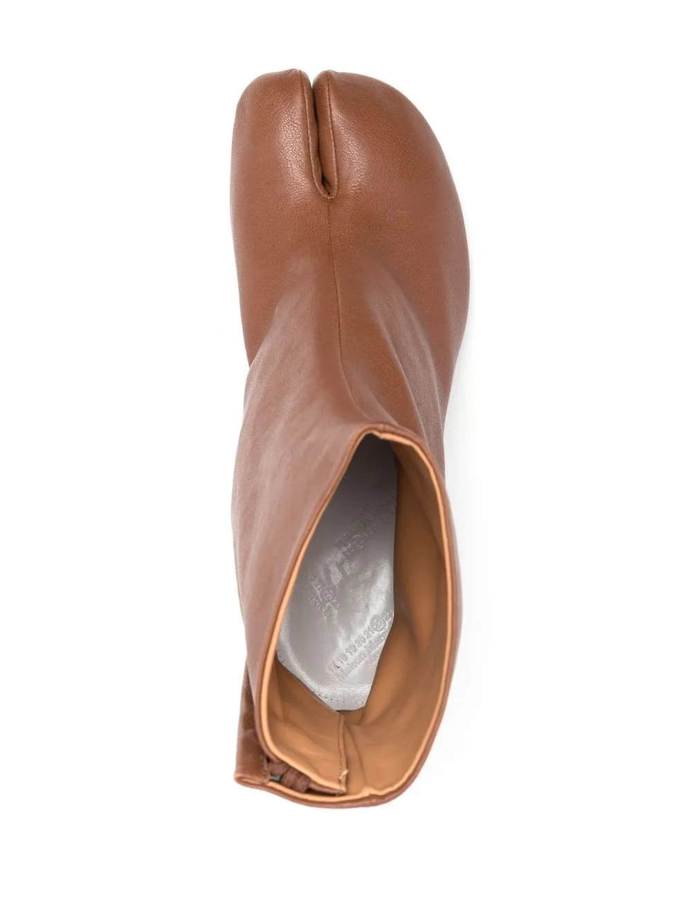 Marron Tobacco, cuir de veau, bout Tabi signature, fermoir crochet à l’arrière, talon haut épais.