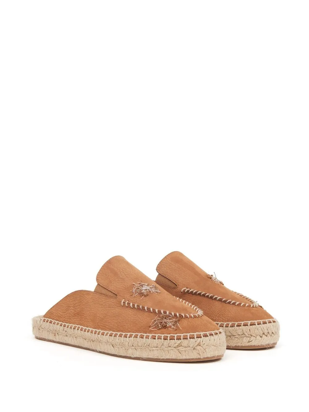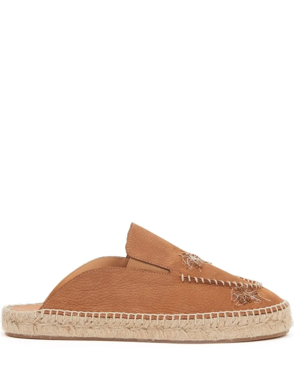 Brun, veau velours, couture décorative, bout rond, design à enfiler, semelle en jute tressé.