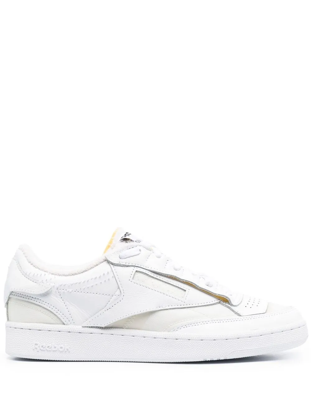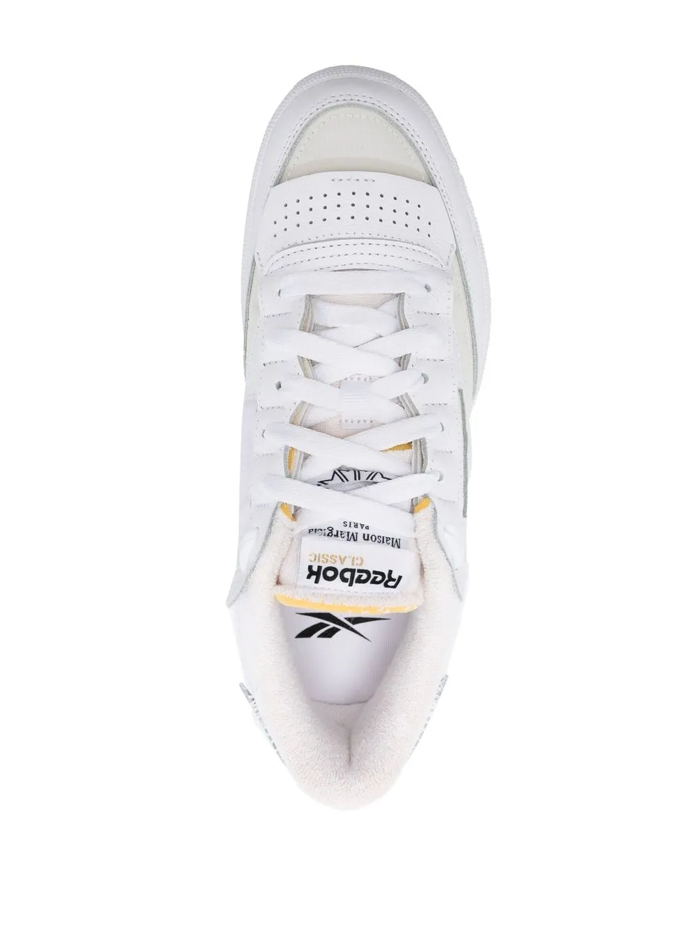 Blanc, cuir de veau, languette à patch logo, détails de perforations, bout rond, fermeture à lacer sur le devant, semelle intérieure à logo, semelle extérieure en caoutchouc.