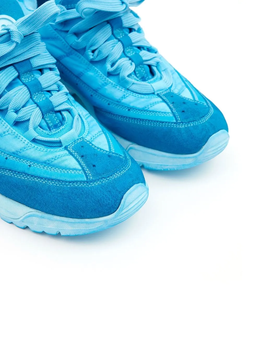 Bleu ciel, cuir de veau, coton, liseré en cuir, design à empiècements, bout rond, fermeture à lacer sur le devant, semelle crantée en caoutchouc.