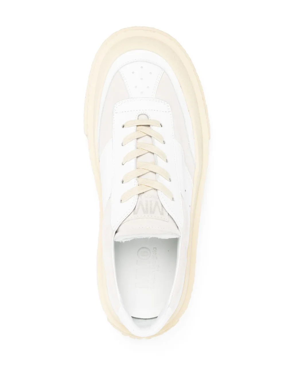 Blanc, beige, cuir, design à empiècements, languette à logo embossé, détails de perforations, bout rond, lien de resserrage, semelle épaisse en caoutchouc, semelle à plateforme.