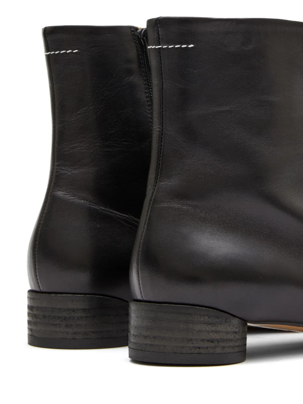 Noir, cuir de veau, logo à point unique signature , fermeture zippée sur le côté, bout rond, petit talon épais.