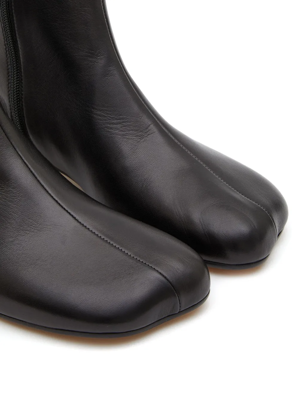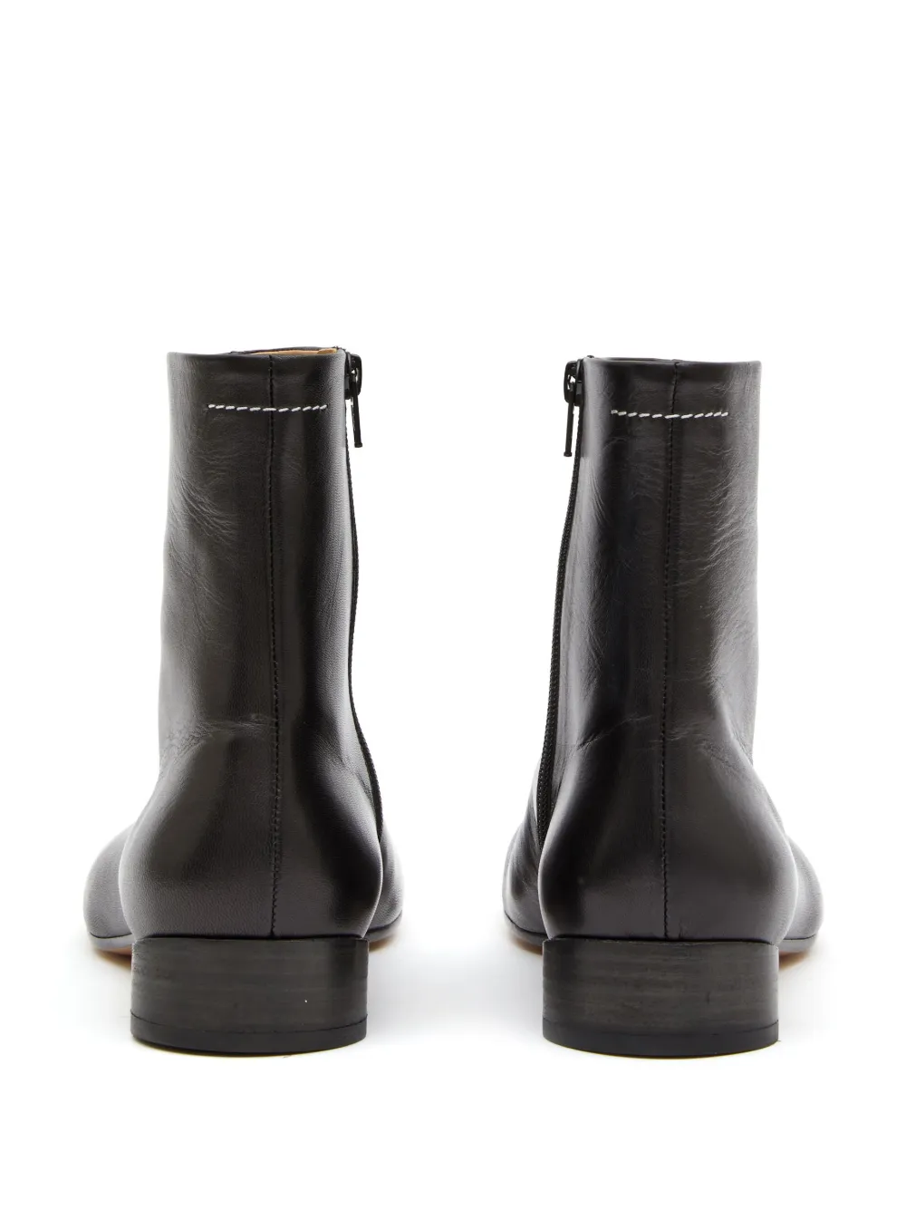 Noir, cuir de veau, logo à point unique signature , fermeture zippée sur le côté, bout rond, petit talon épais.