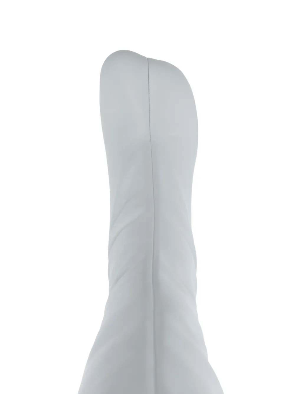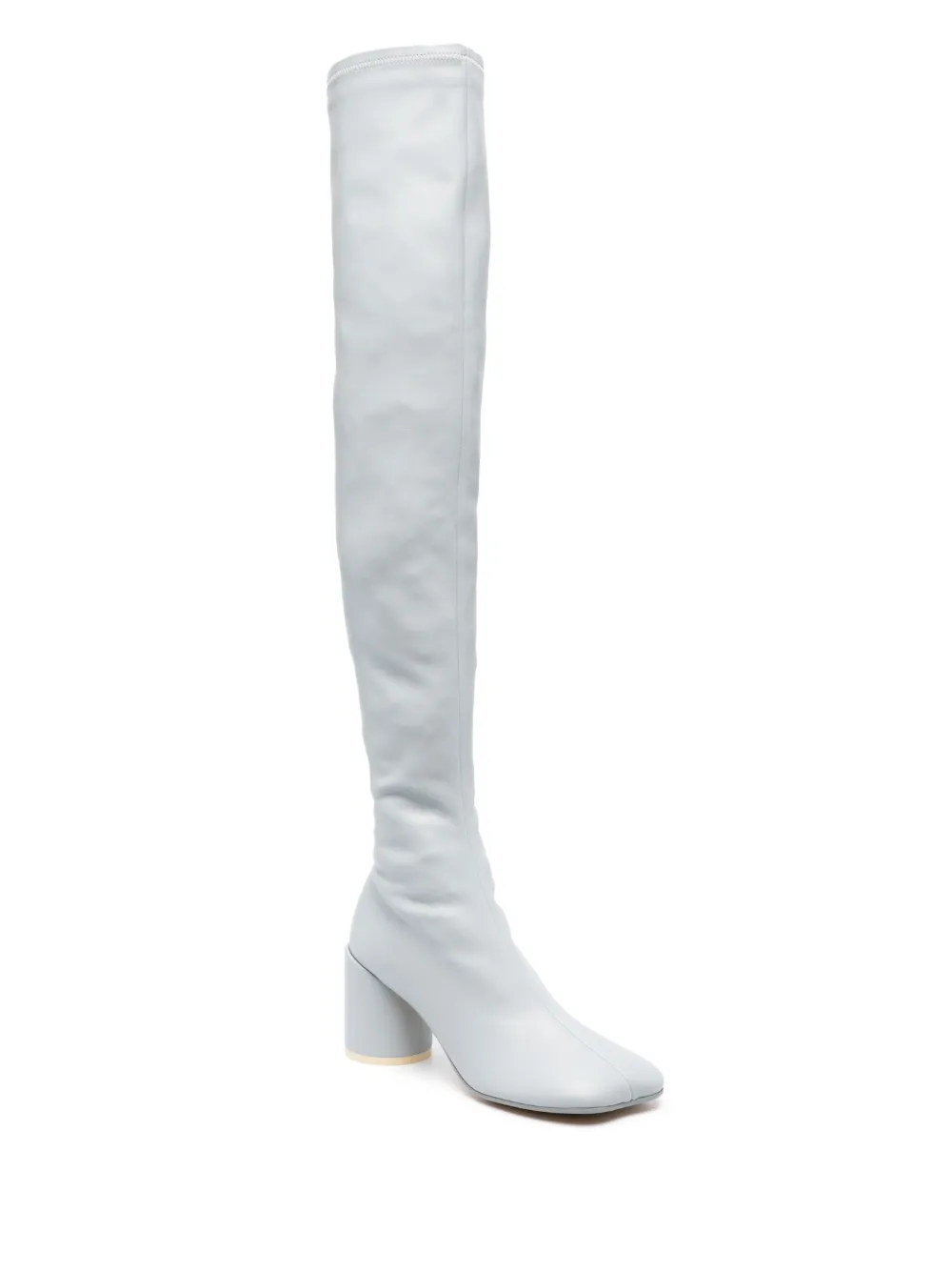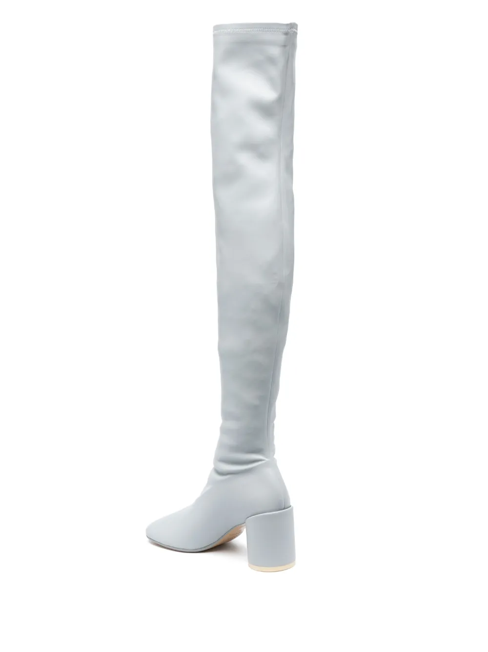 Bleu pâle, cuir de veau, construction stretch, bout asymétrique, fermeture zippée dissimulée sur le côté, talon mi-haut épais, hauteur cuisse.