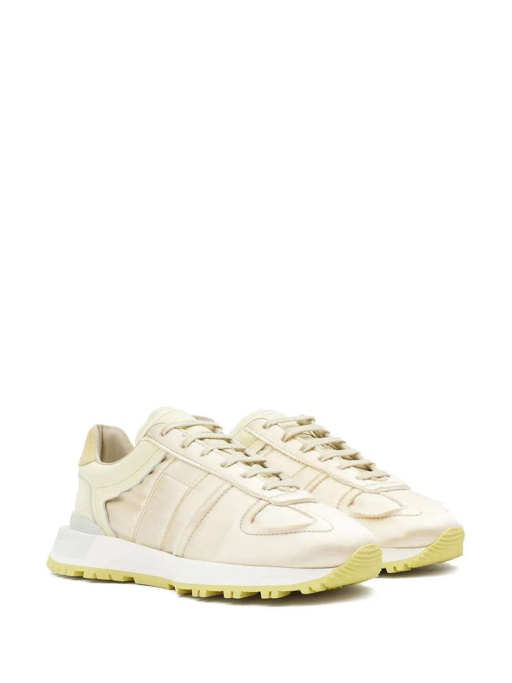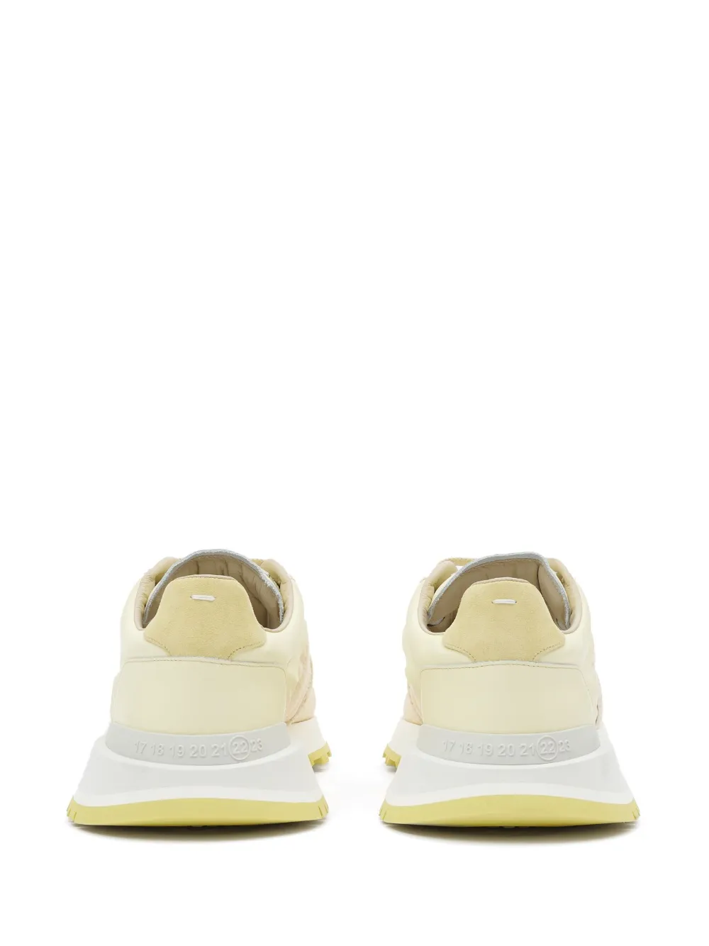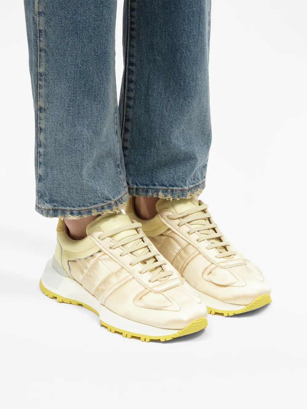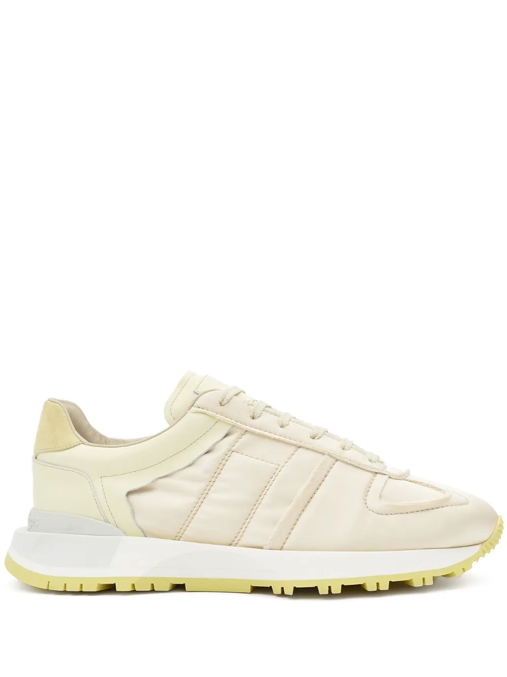 Jaune clair, cuir de veau, design à empiècements, logo numéroté signature, logo à point unique signature , bout en amande, fermeture à lacer sur le devant, semelle intérieure à logo, semelle en caoutchouc.