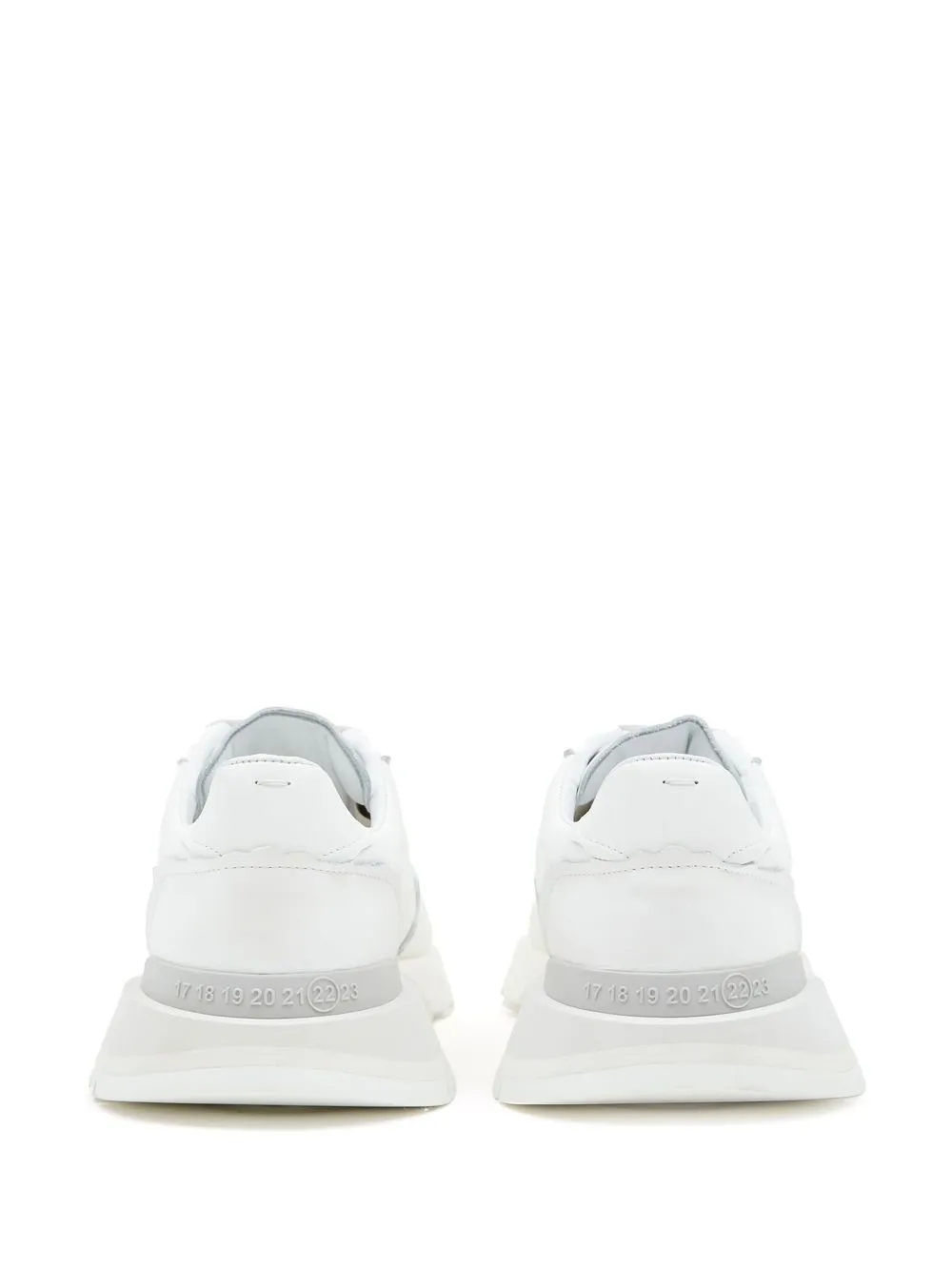 Blanc, cuir de veau, design à empiècements, logo numéroté signature, logo à point unique signature , bout rond, fermeture à lacer sur le devant, semelle intérieure à logo, semelle en caoutchouc.