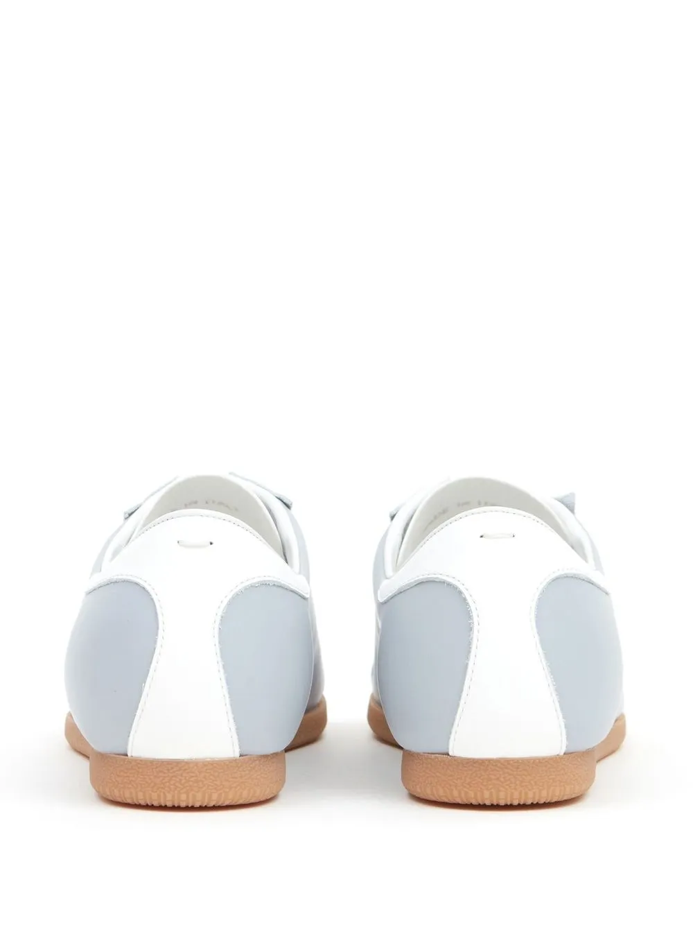 Bleu clair, cuir de veau, empiècement en daim, bout rond, fermeture à lacer sur le devant, contrefort contrastant, semelle plate en caoutchouc.