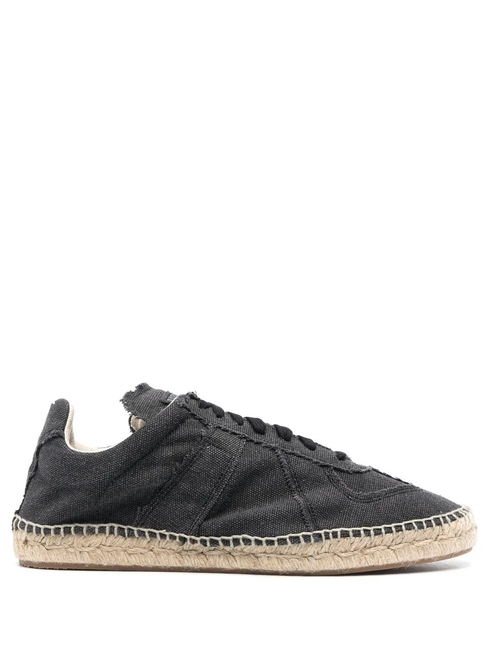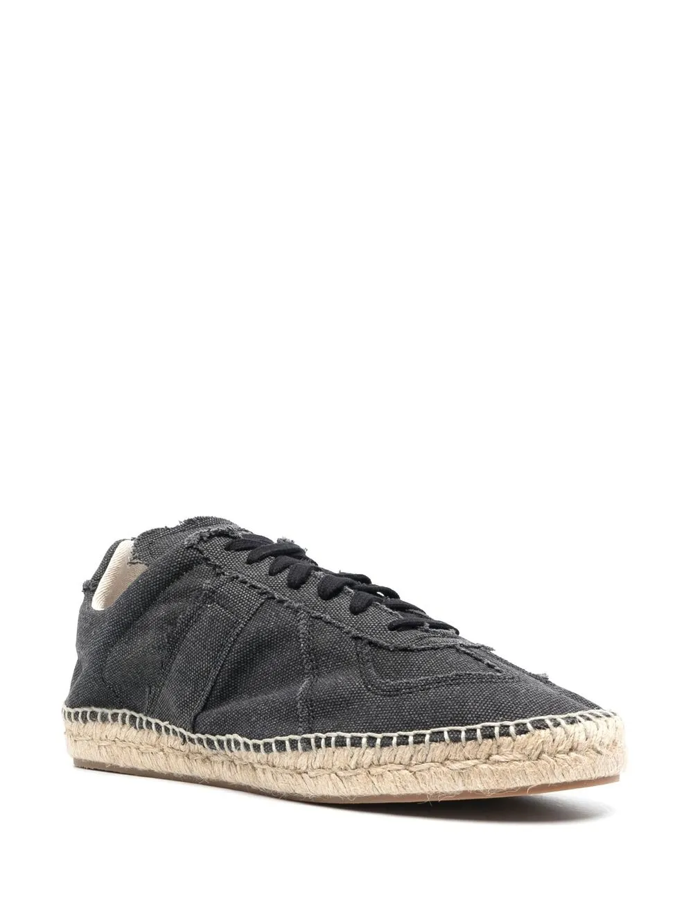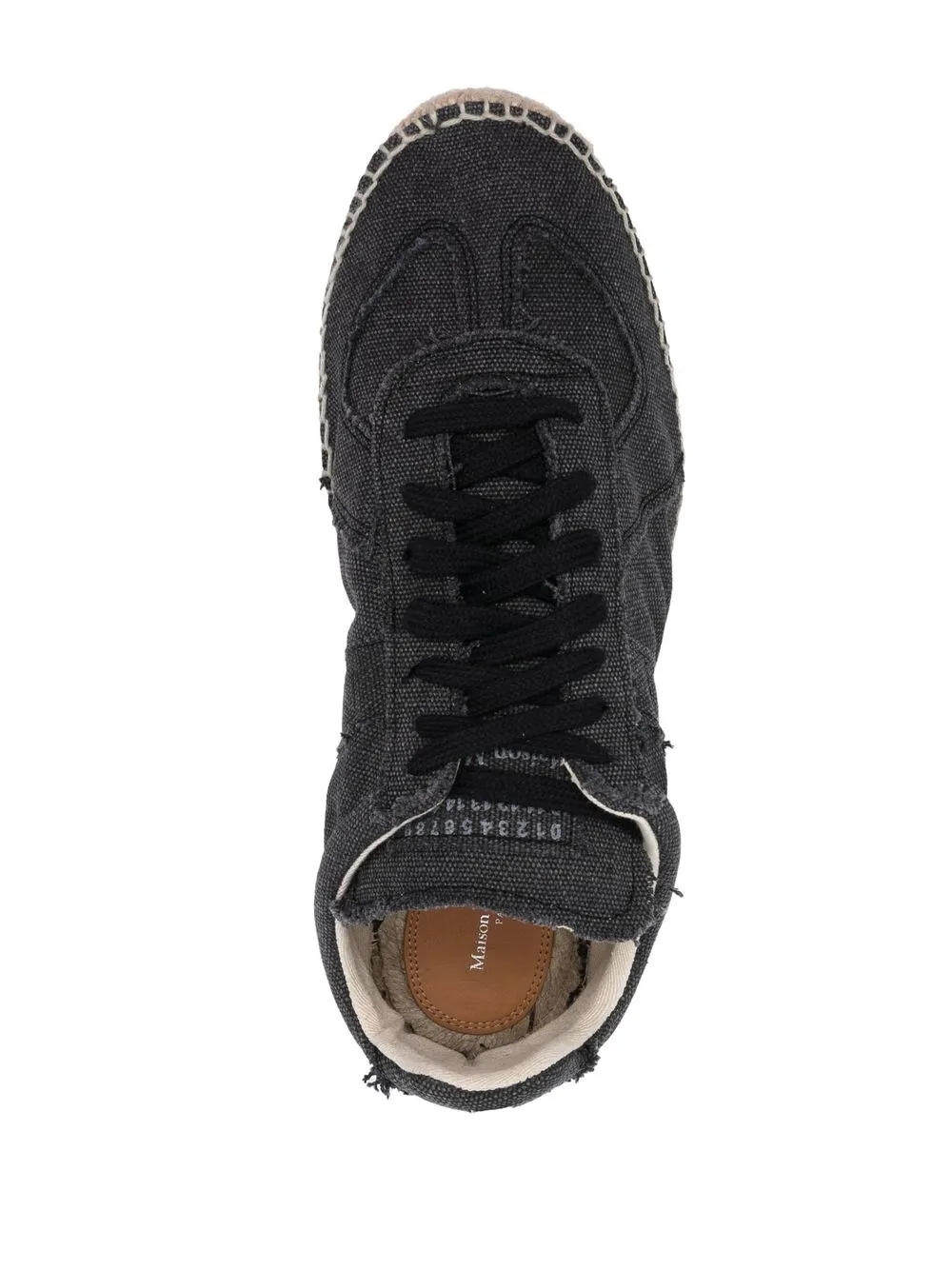 Gris foncé, coton mélangé, cuir de veau, détails de franges, logo numéroté signature, fermeture à lacer sur le devant, bout rond, semelle intérieure à logo, semelle plate en caoutchouc.