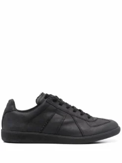 Logo à point unique signature , empiècements géométriques, bout rond, fermeture à lacer sur le devant, coutures ton sur ton, languette à logo embossé, semelle intérieure à logo, chevilles rembourrées, semelle extérieure en caoutchouc. Couleur : noir. Matière : cuir.