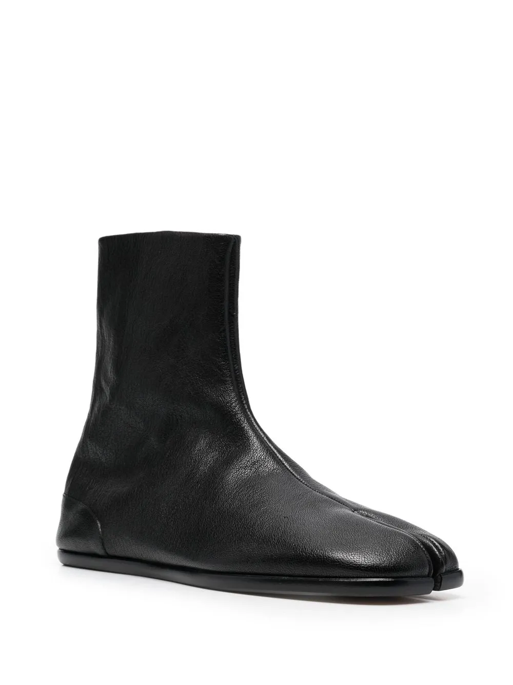Bout Tabi signature, logo à point unique signature , hauteur cheville, semelle plate en caoutchouc, fermeture dissimulée sur le côté. Couleur : noir. Matière : cuir.