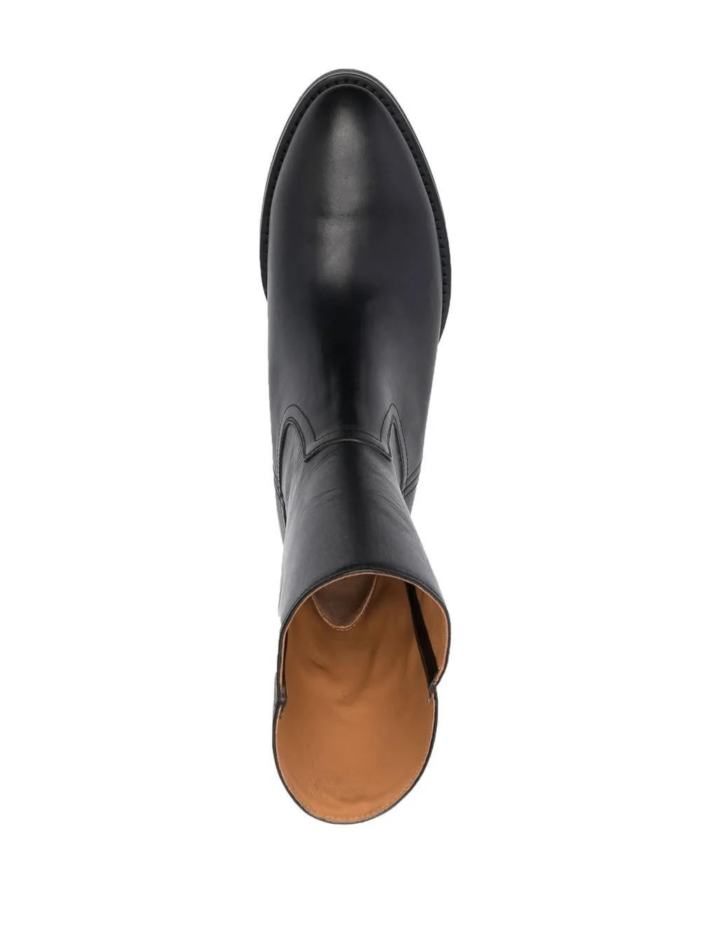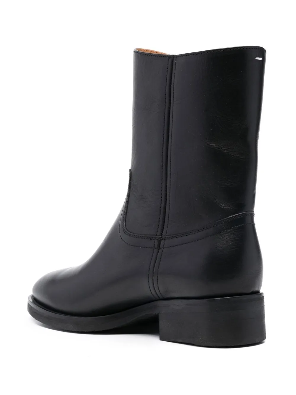 Noir, cuir de veau, coutures ton sur ton, bout en amande, petit talon épais, à enfiler, hauteur cheville.