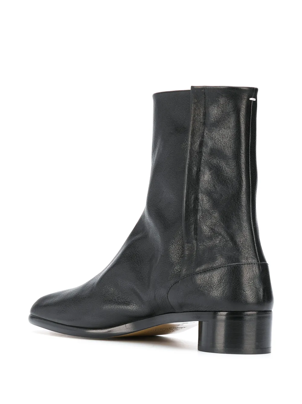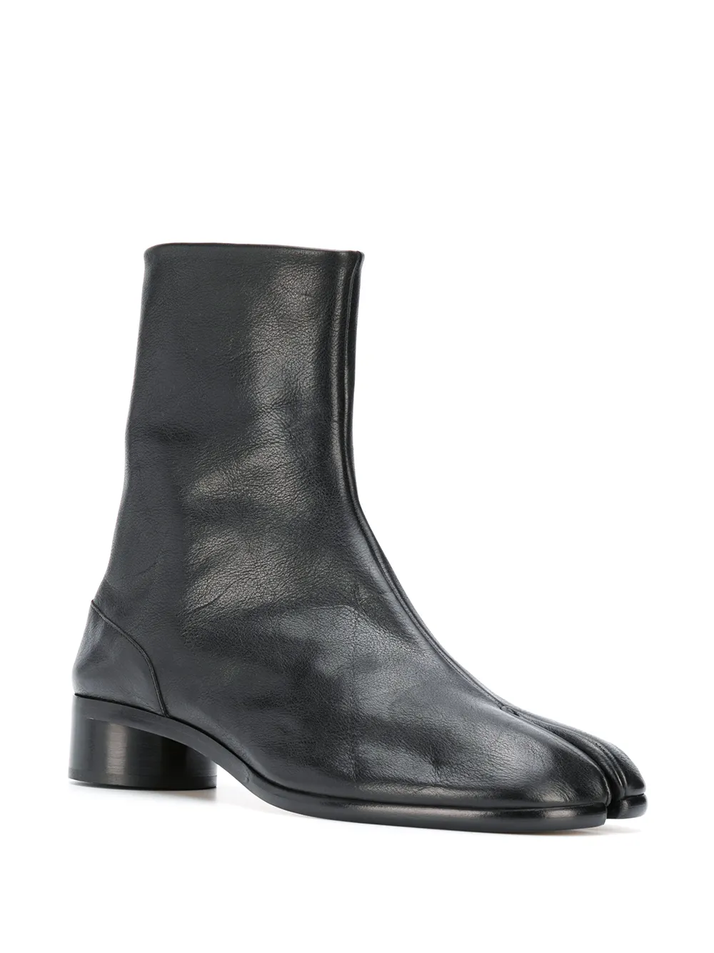 Bottines à bout Tabi en cuir Maison Margiela avec bout tabi, fermeture latérale zippée et petit talon. Couleur : noir.