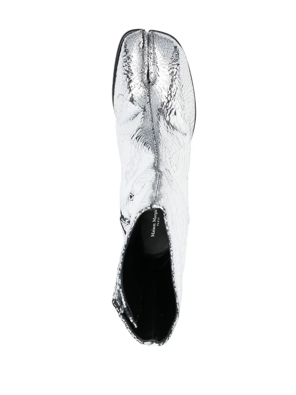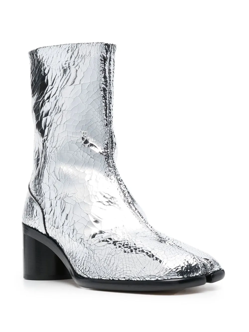 Argent, cuir de veau, doublure en cuir, effet métallisé, bout fendu, fermeture zippée sur le côté, hauteur cheville, talon mi-haut épais.