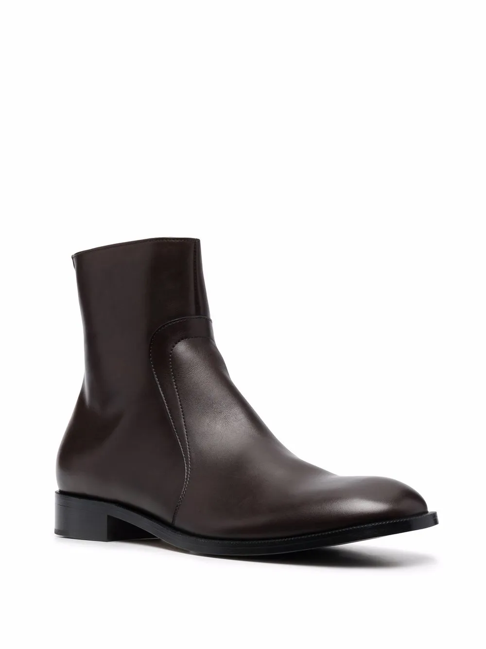 Coutures ton sur ton, bout rond, fermeture zippée sur les côtés, semelle intérieure à logo, semelle extérieure en caoutchouc. Couleur : marron. Matière : cuir.