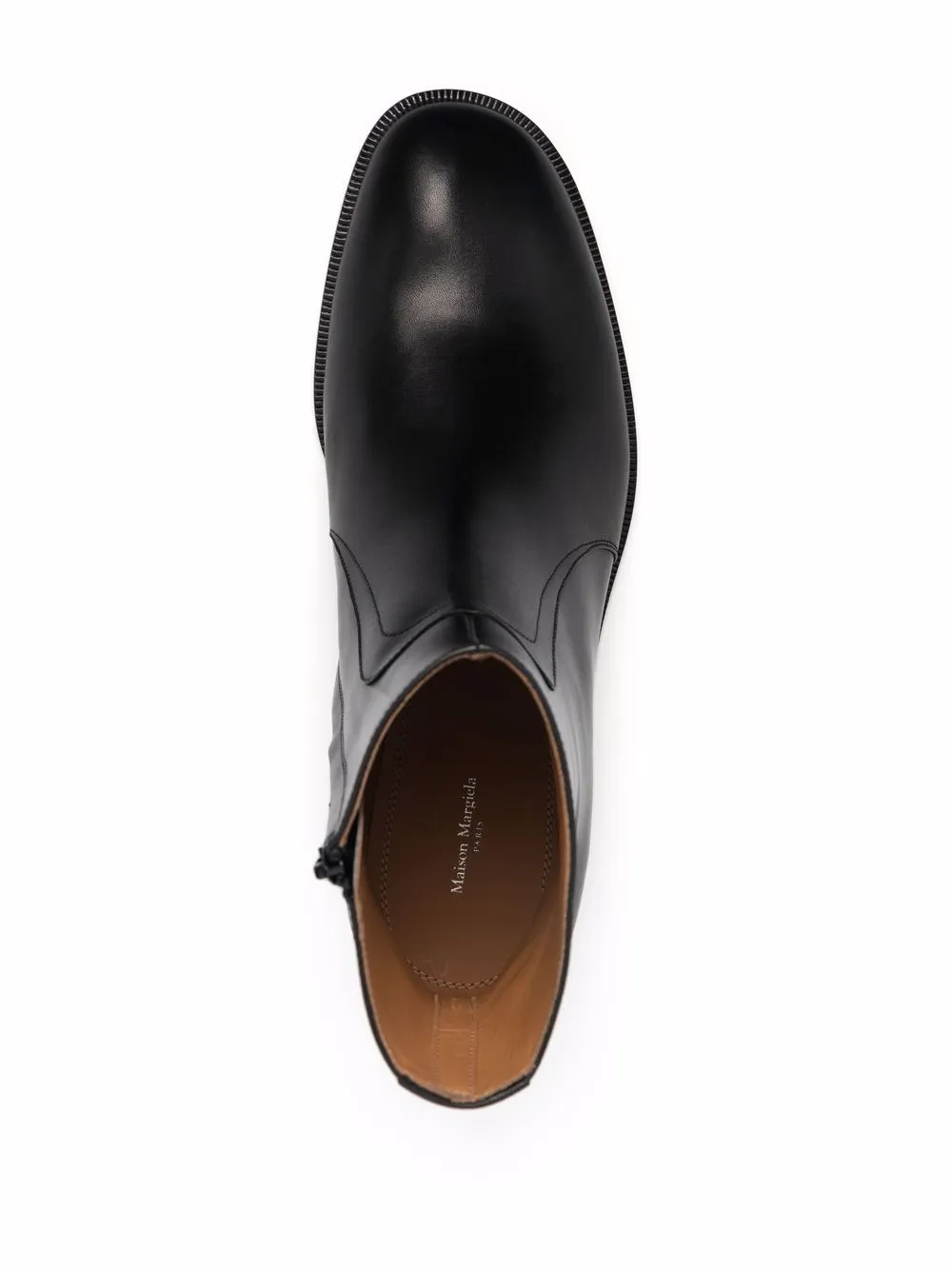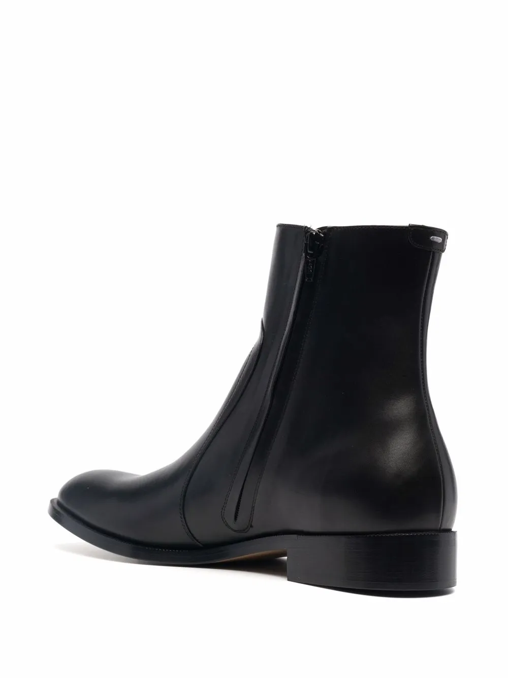 Doublure en cuir, bout rond, fermeture zippée sur le côté, hauteur cheville, petit talon.
