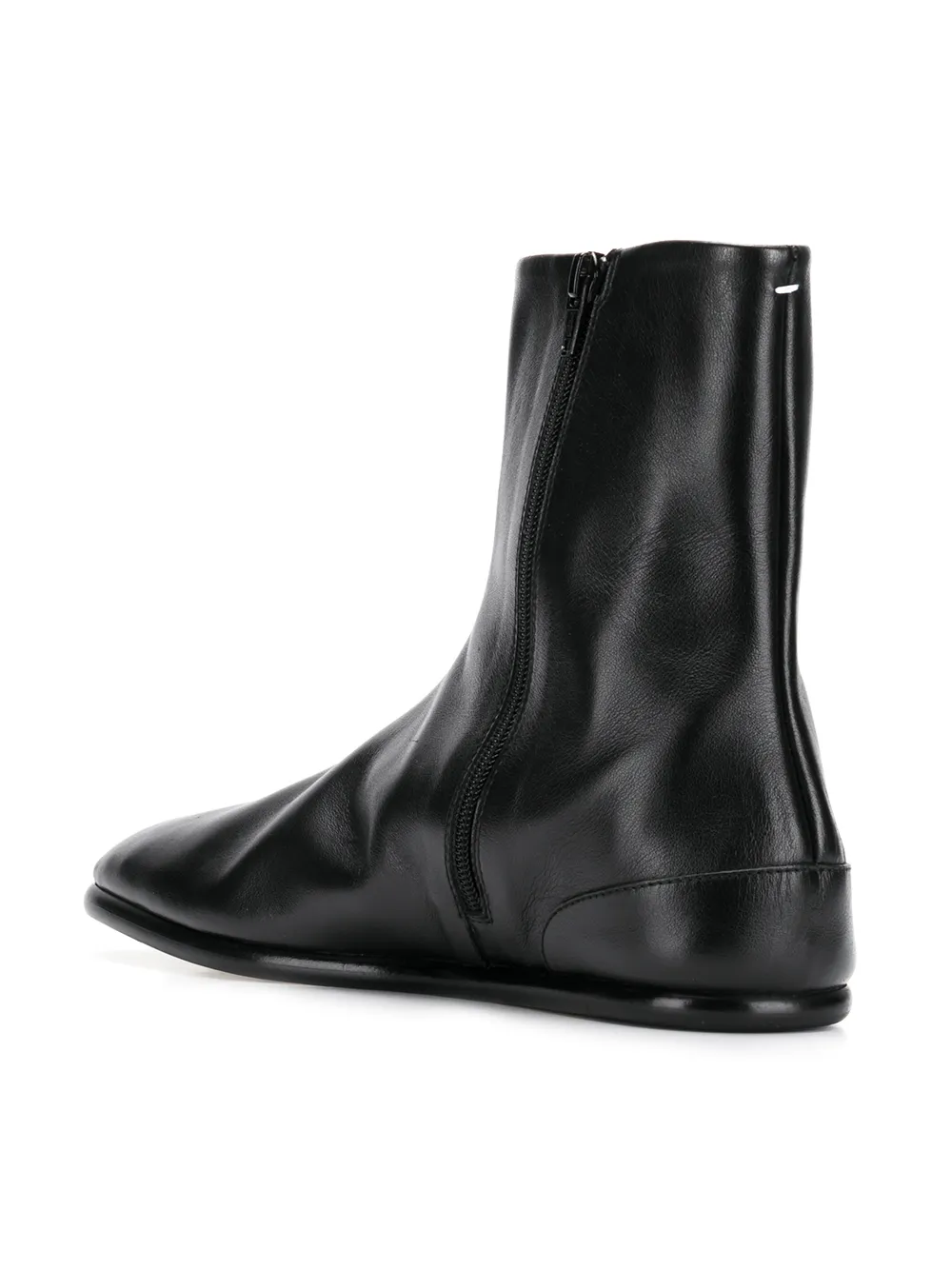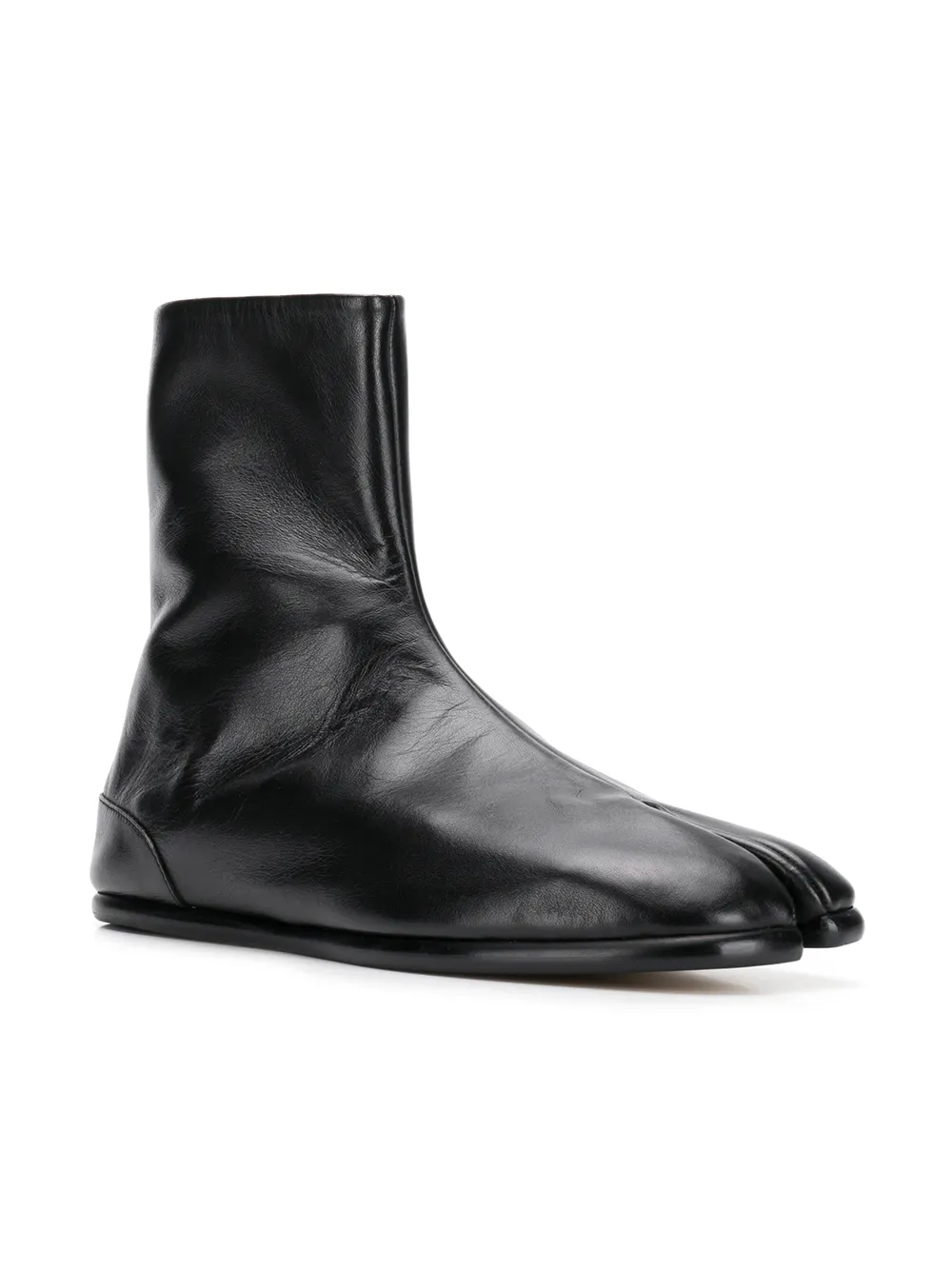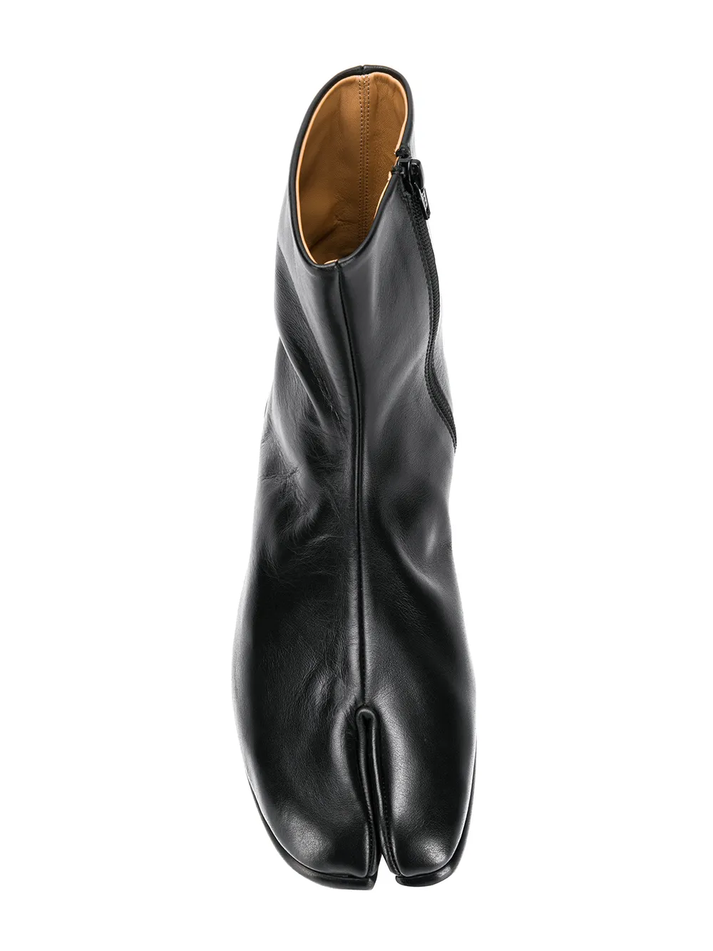 Bottines Tabi en cuirs Maison Margiela avec hauteur cheville et fermeture latérale zippée. Couleur : noir.