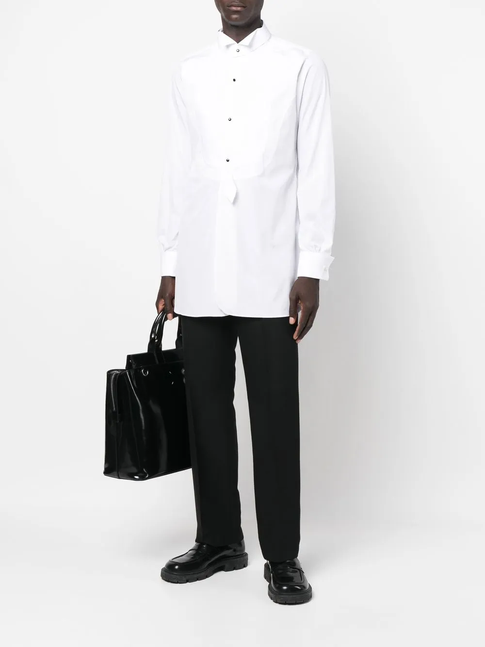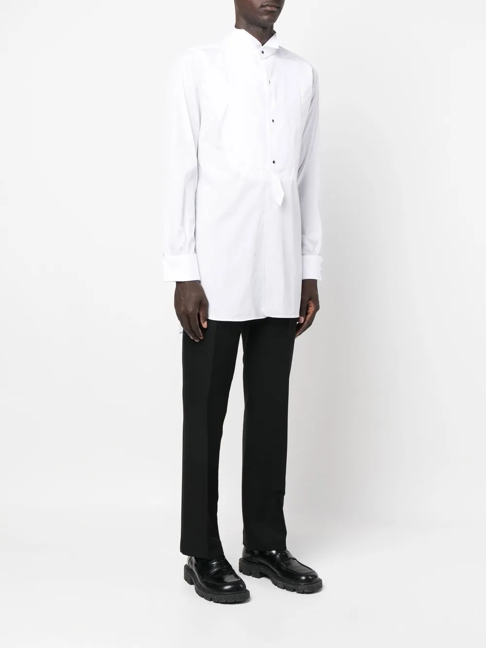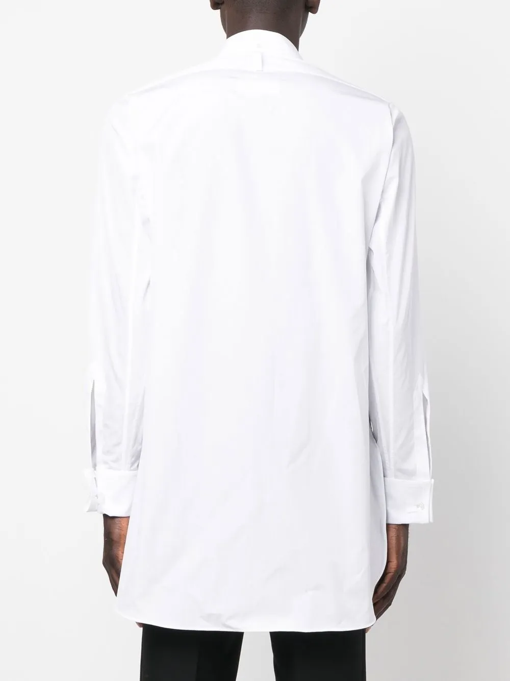 Blanc, coton, col cassé, fermeture boutonnée, manches longues, coupe longue, manches à poignets boutonnés.