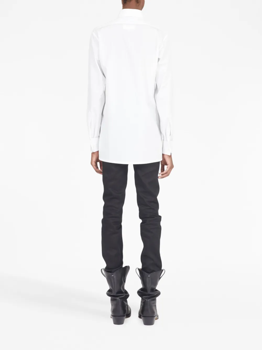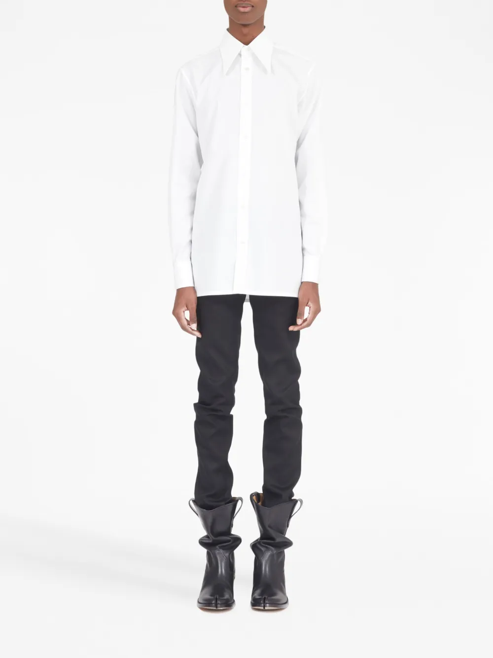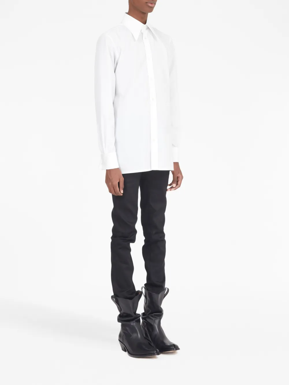Blanc optique, coton, fentes latérales, col pointu, boutonnière sur le devant, manches longues, manches à poignets boutonnés, ourlet droit.