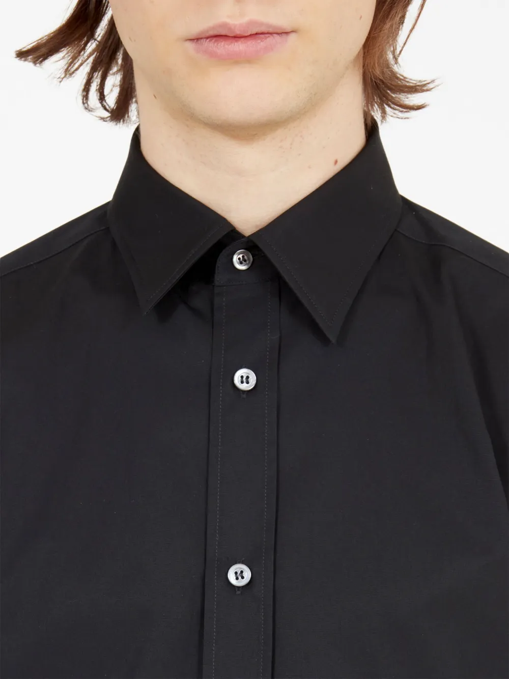 Noir de jais, coton, texture popeline, logo brodé signature, col pointu, boutonnière sur le devant, manches courtes, ourlet droit.