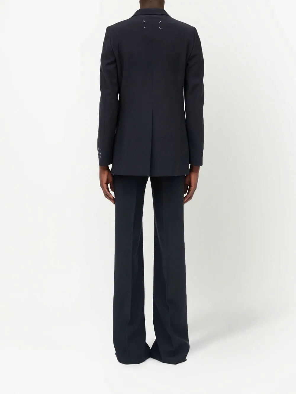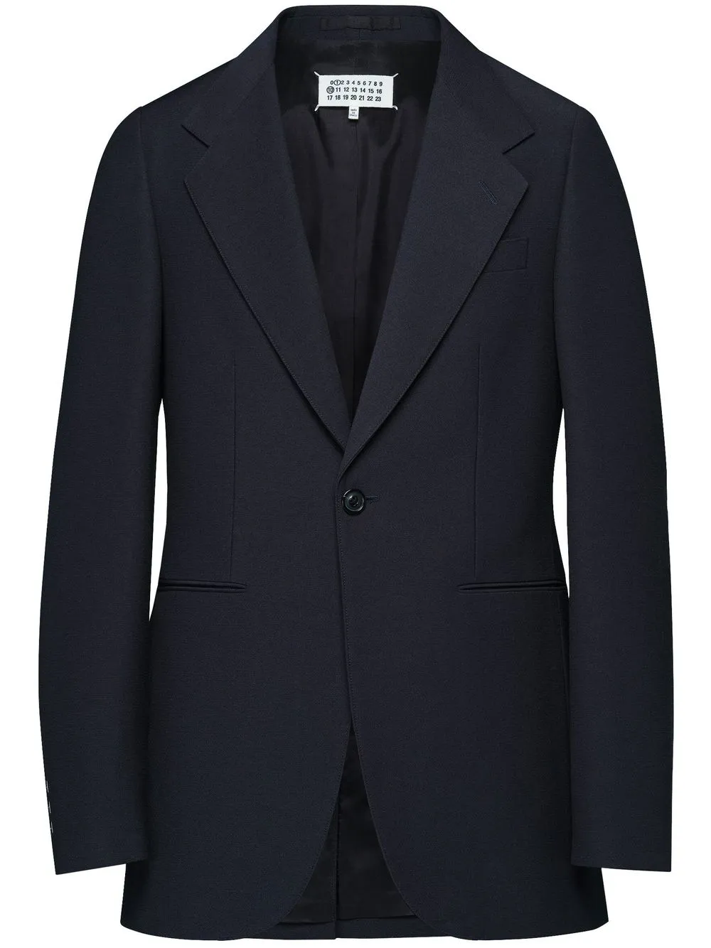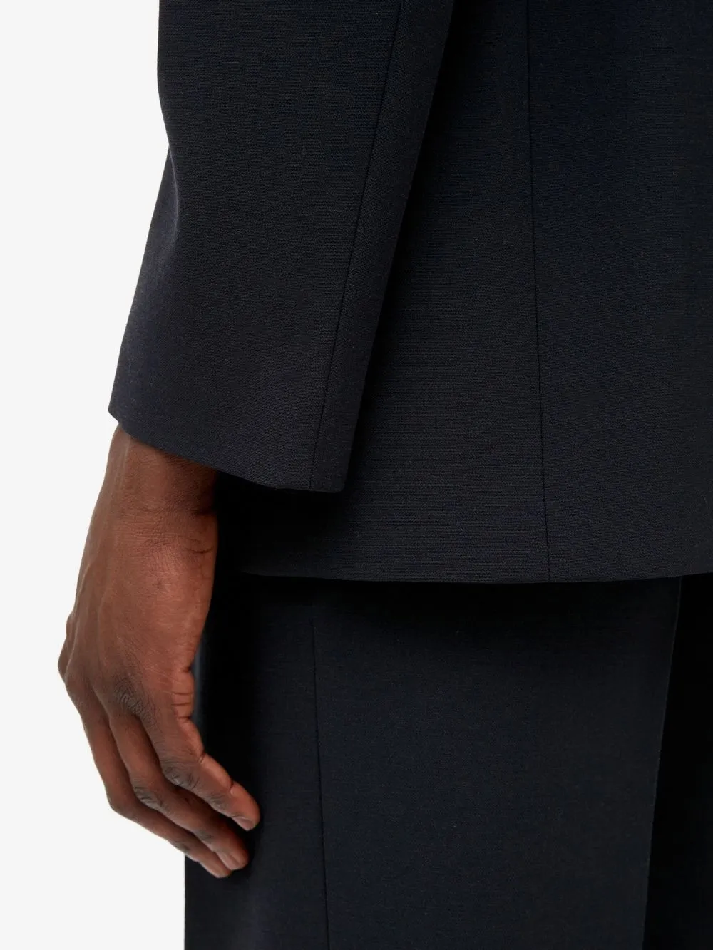 Bleu marine, laine vierge mélangée, revers crantés, boutonnière sur le devant, deux poches passepoilées sur le devant, manches longues, plis marqués, passants de ceinture, fermeture dissimulée sur le devant, coupe droite, coupe longue.