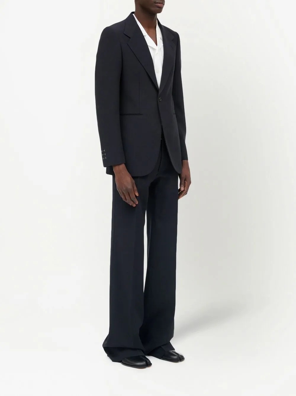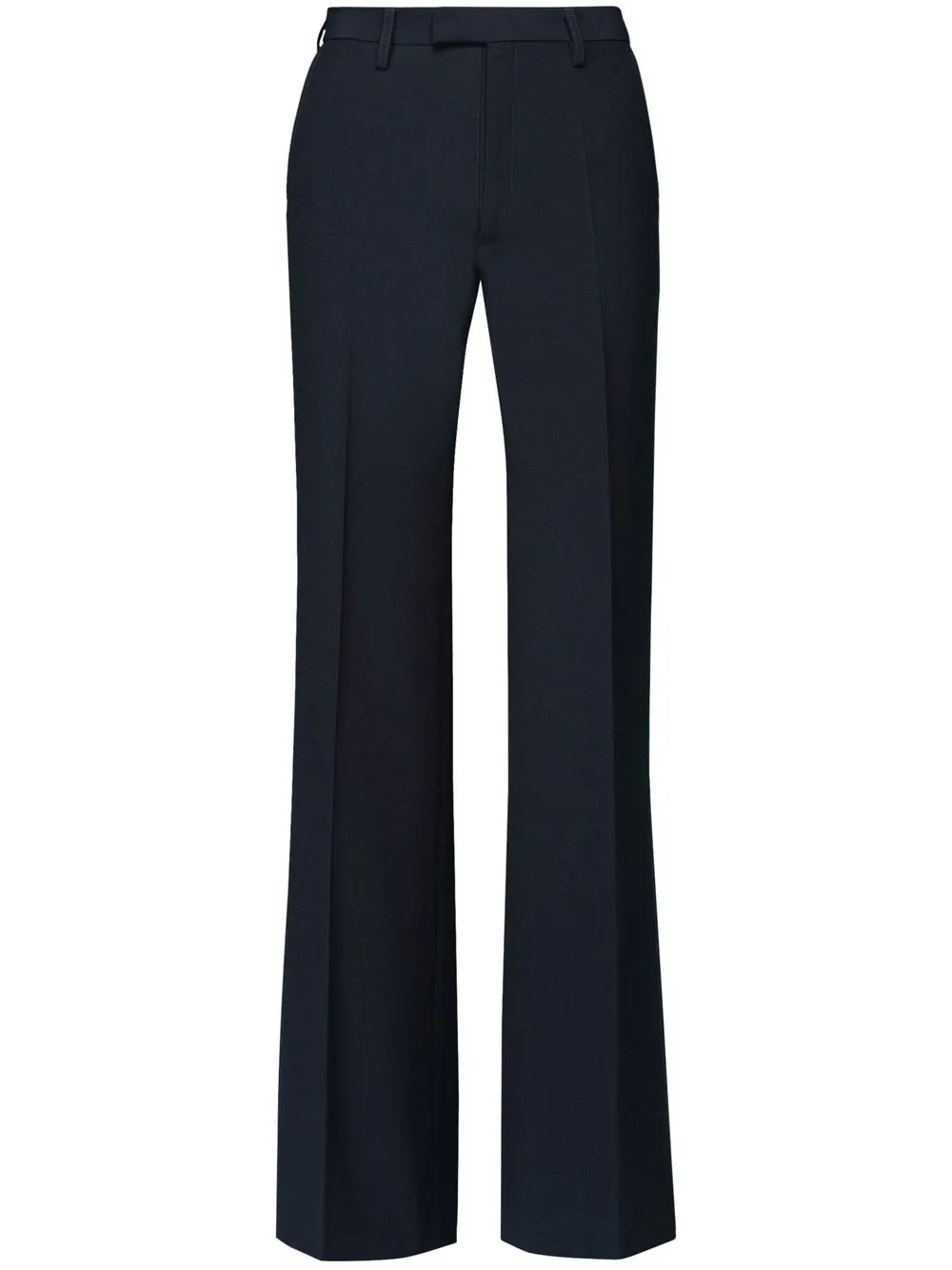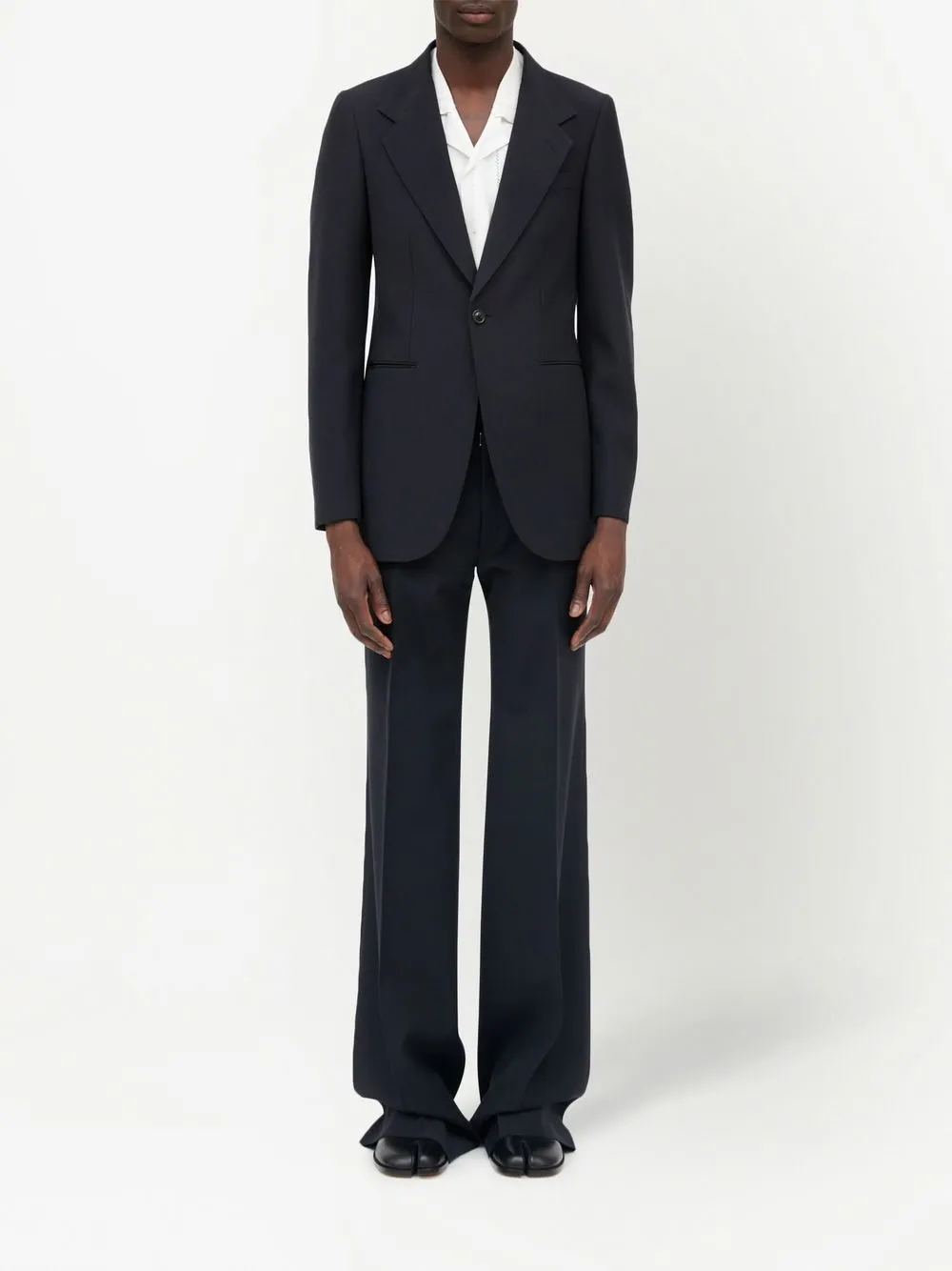 Bleu marine, laine vierge mélangée, revers crantés, boutonnière sur le devant, deux poches passepoilées sur le devant, manches longues, plis marqués, passants de ceinture, fermeture dissimulée sur le devant, coupe droite, coupe longue.