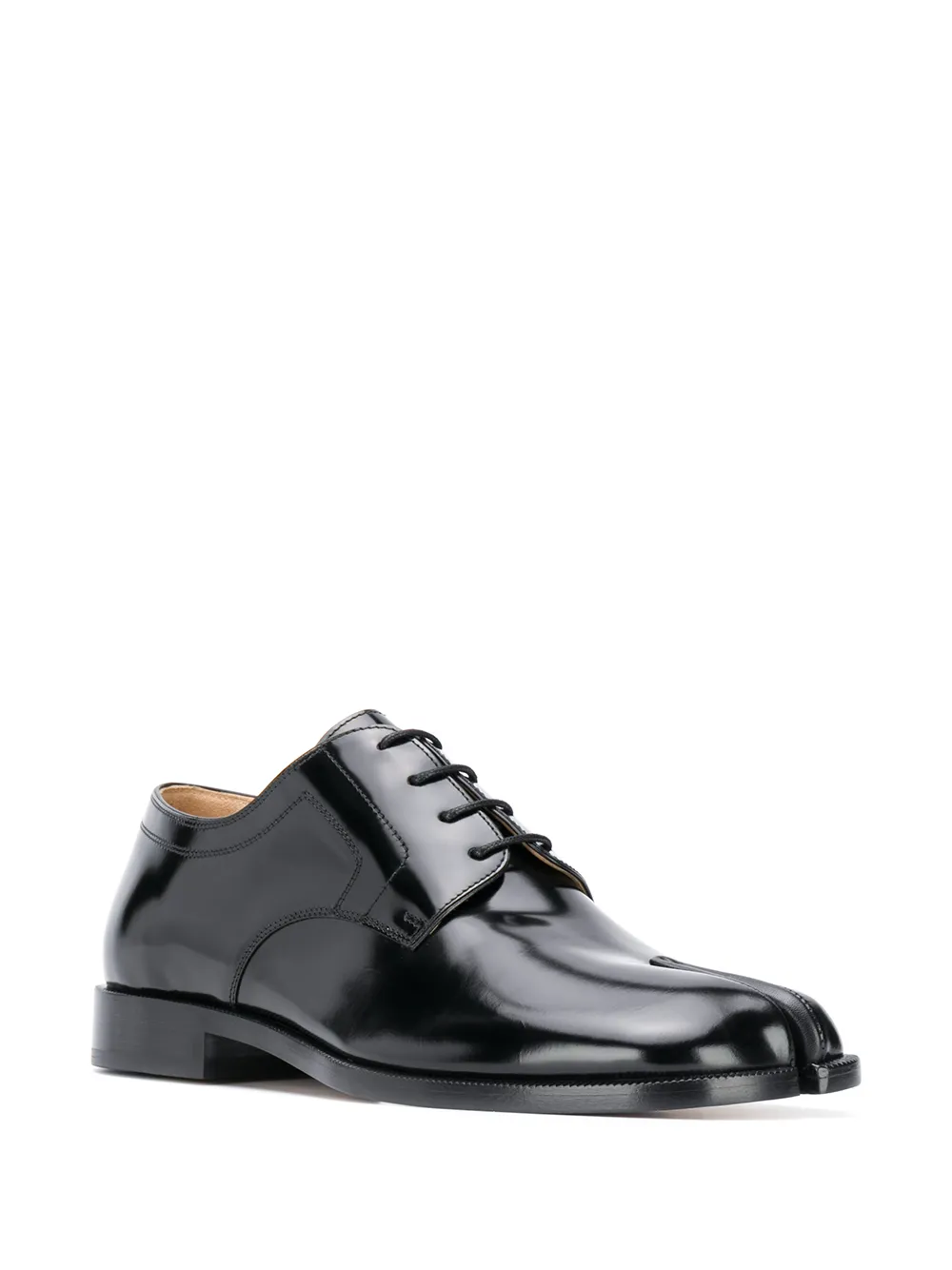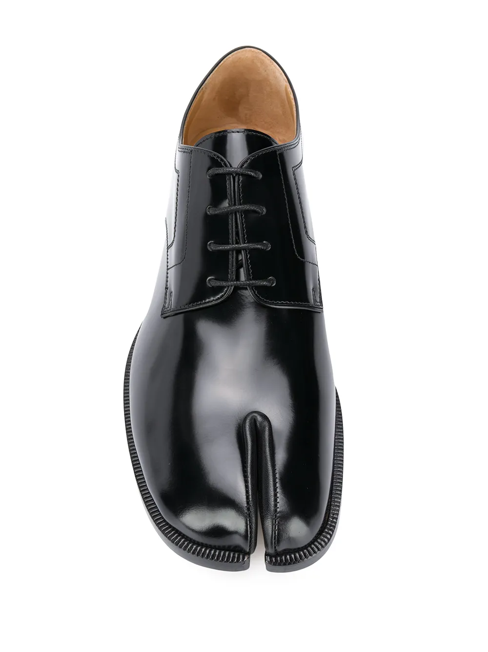 Bout Tabi, fermeture à lacer sur le devant, semelle plate en cuir. Couleur : noir. Matière : cuir.
