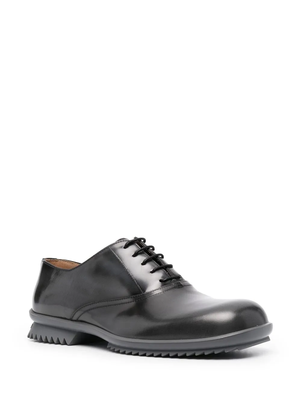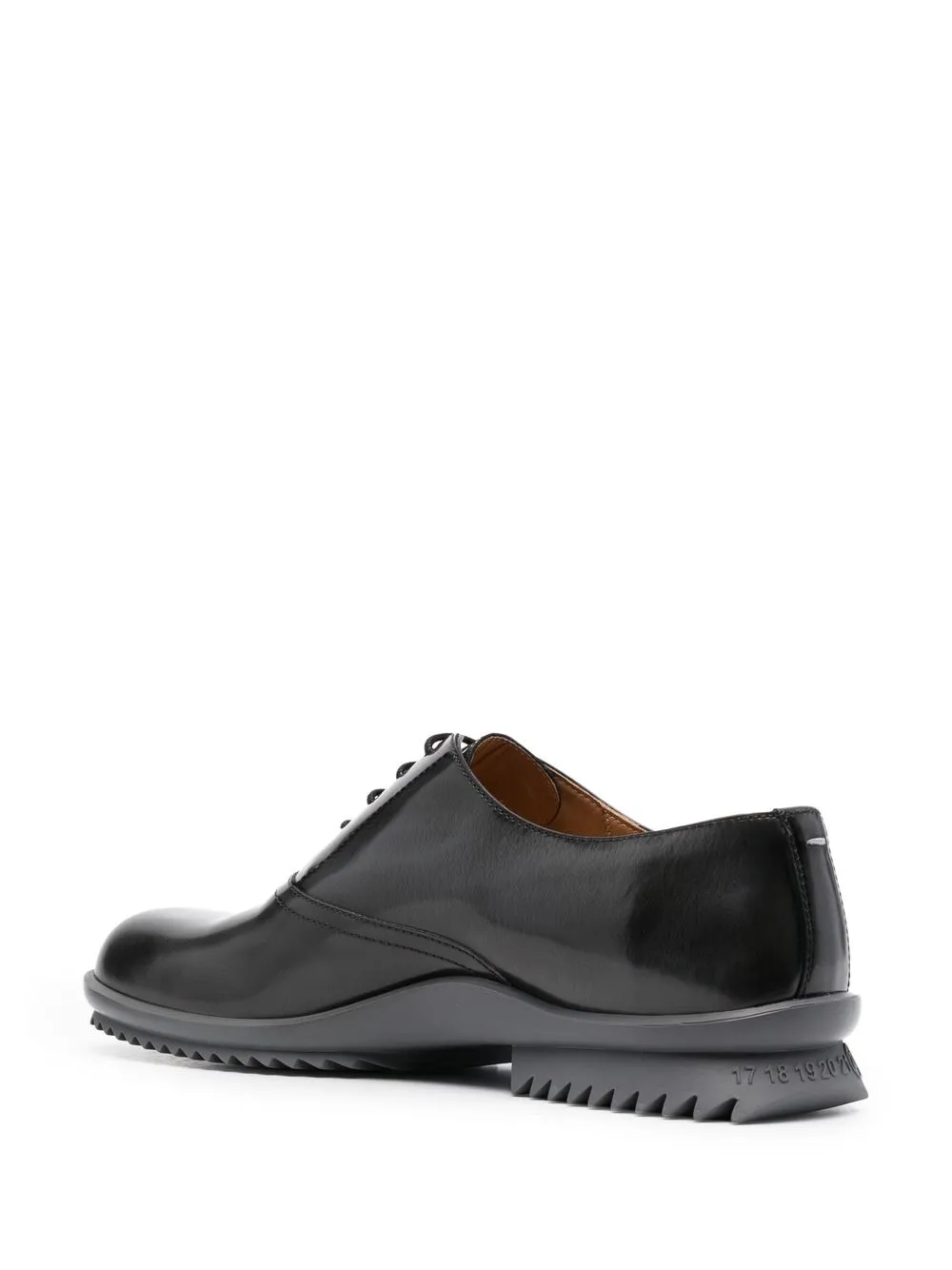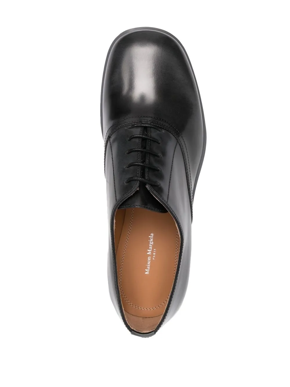 Bout carré, fermeture à lacer sur le devant, semelle intérieure à logo, coutures ton sur ton, logo à point unique signature , logo gravé, semelle crantée en caoutchouc. Couleur : noir. Matière : cuir.