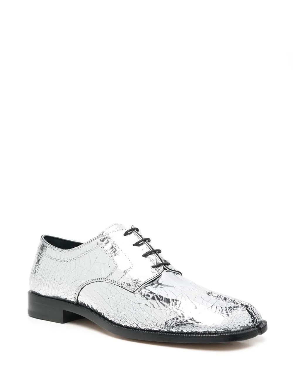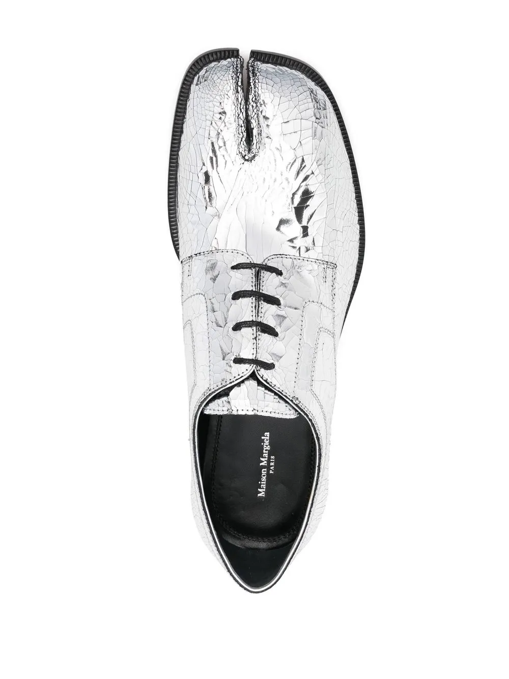 Argenté, cuir de veau, fini métallisé, bout Tabi signature, fermeture à lacer sur le devant, petit talon épais, semelle en cuir.