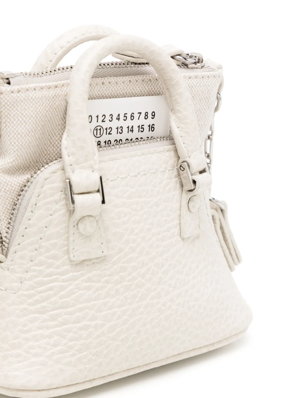 Blanc, cuir de veau, logo numéroté signature, bride porté épaule en chaîne, anses sur le dessus, fermeture zippée sur le dessus, compartiment principal.