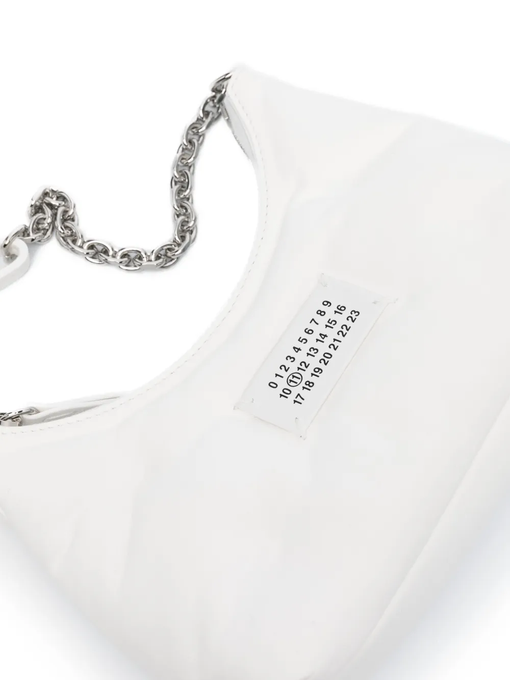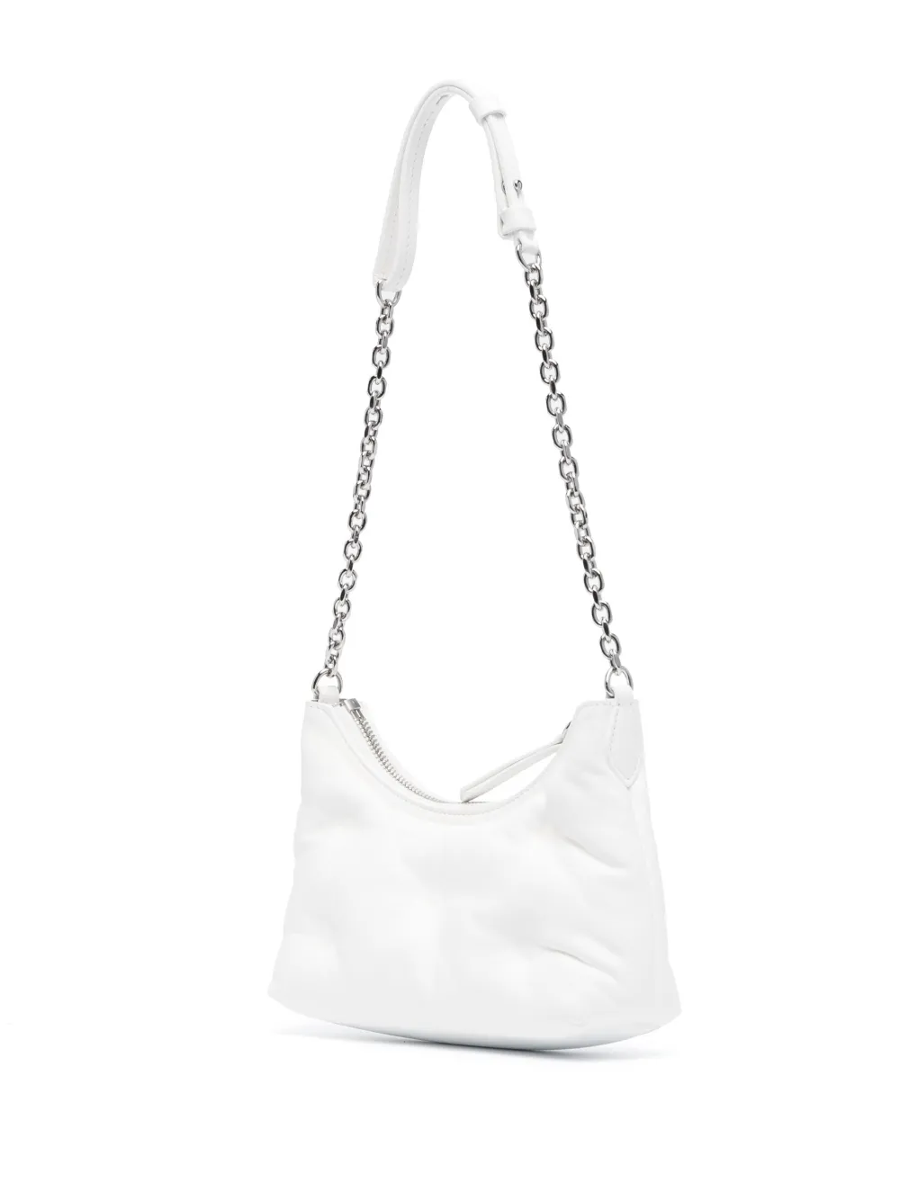 Blanc, cuir, design matelassé, patch logo sur le devant, bride porté épaule en cuir et maillons de chaîne, fermeture zippée sur le dessus, compartiment principal.