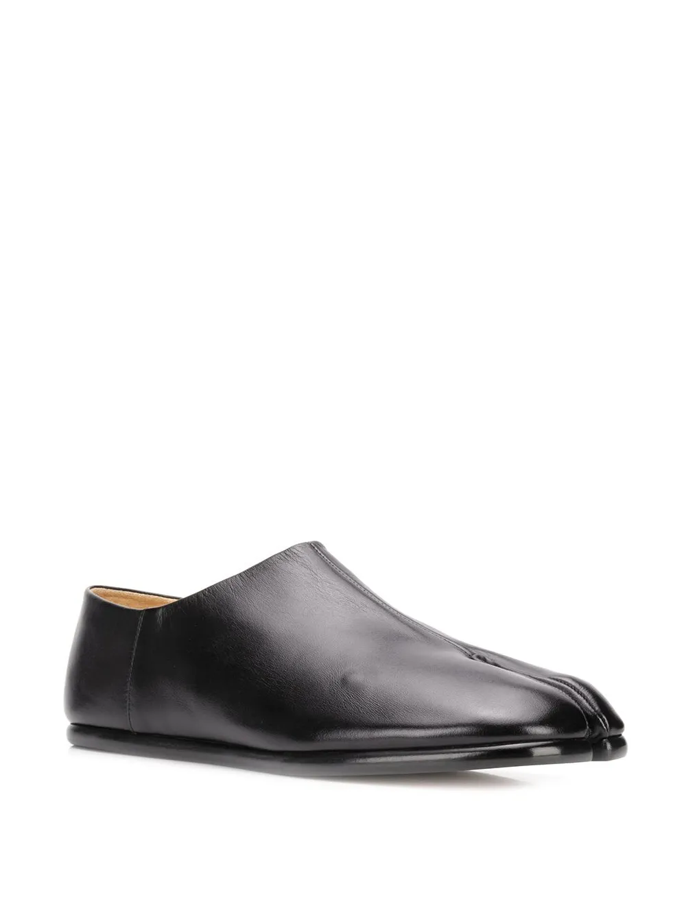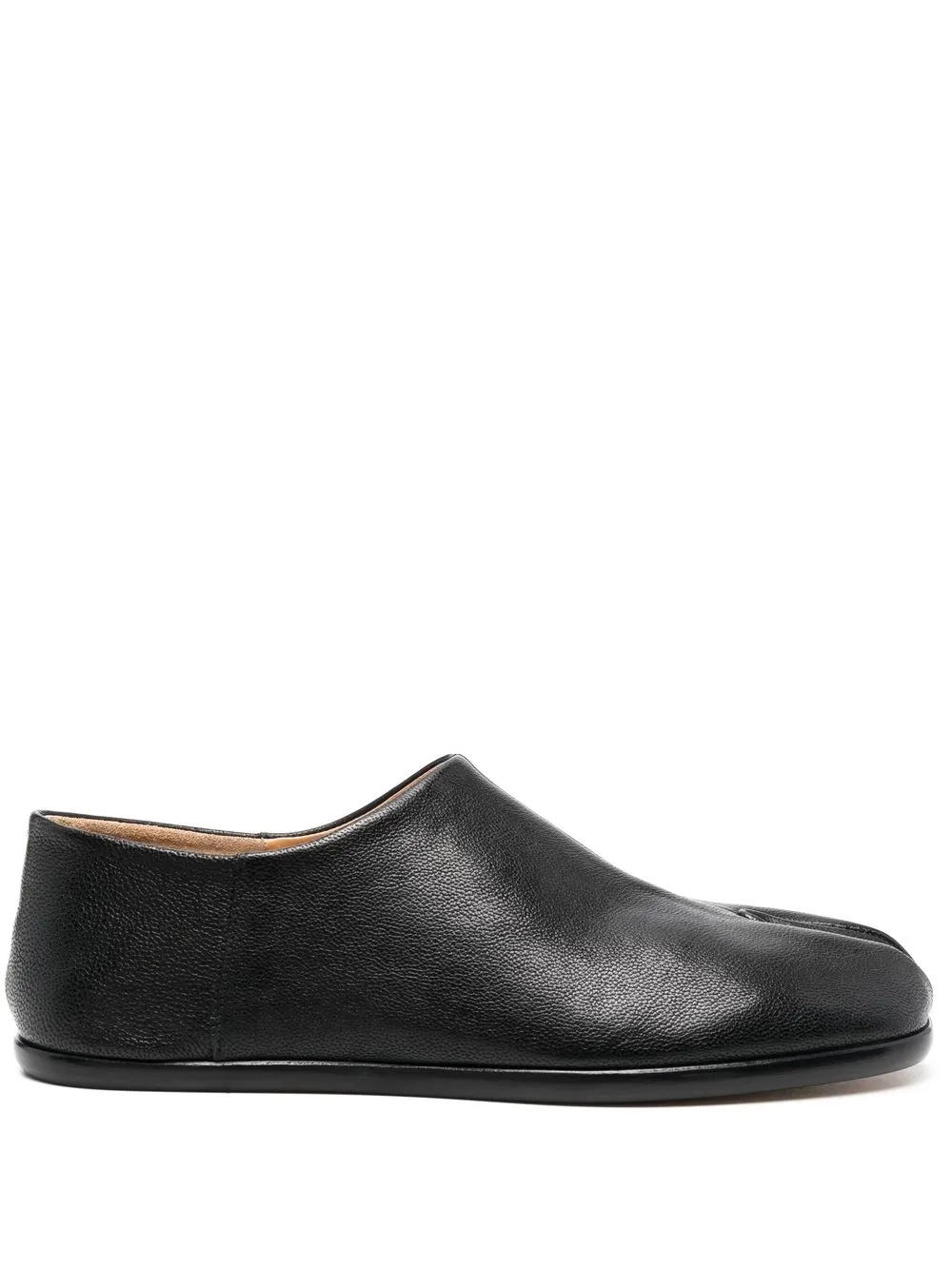 Mocassins Tabi en cuir Maison Margiela avec bout rond, semelle intérieure à logo, points de couture blancs à l’arrière et talon plat. Couleur: noir.