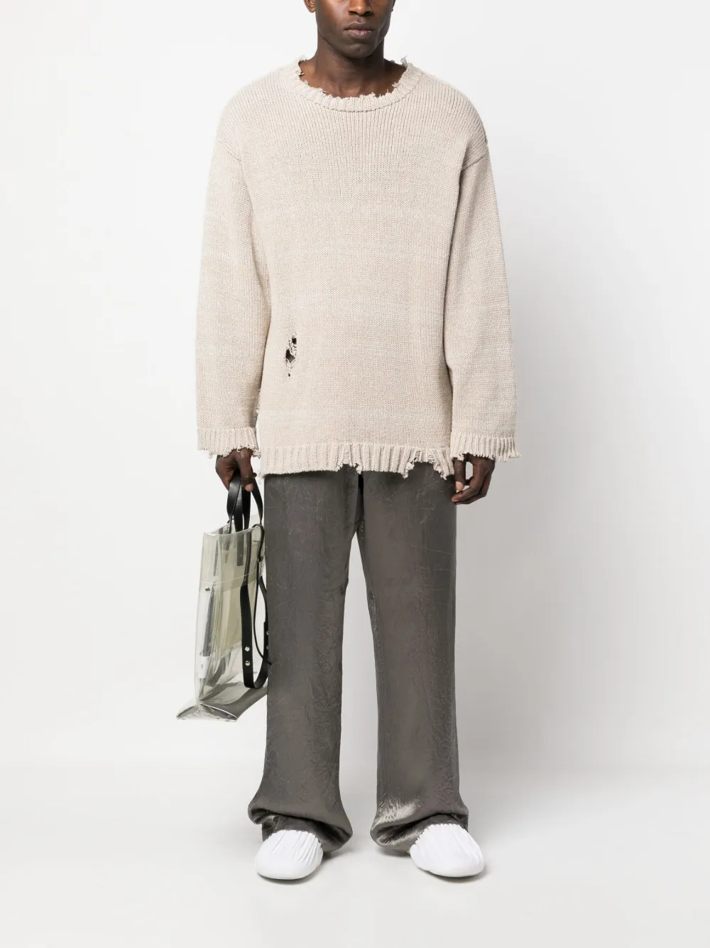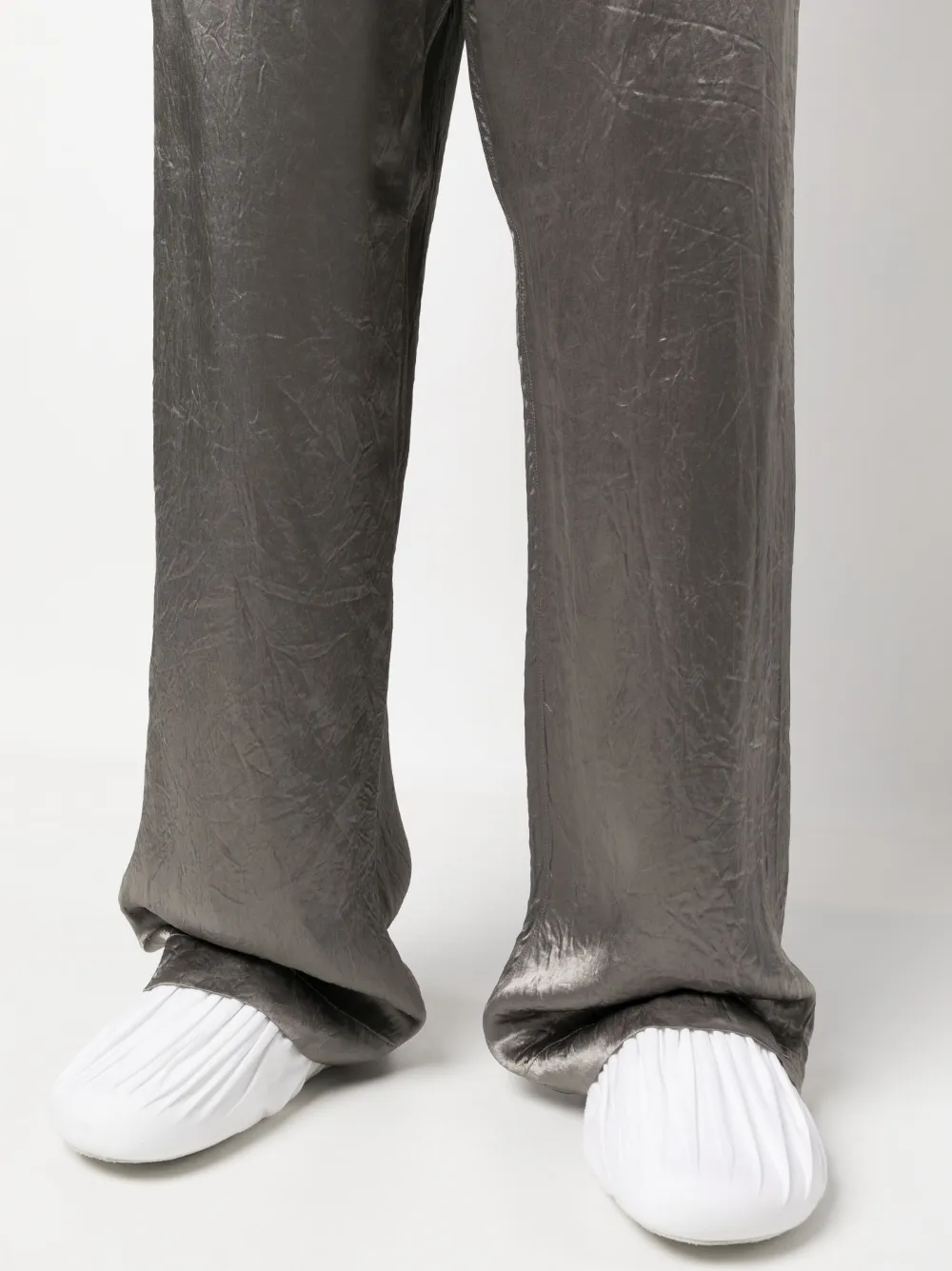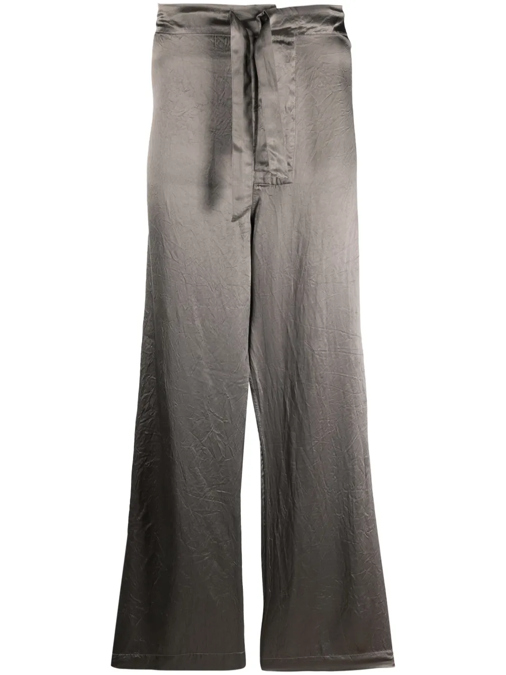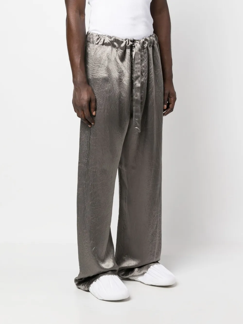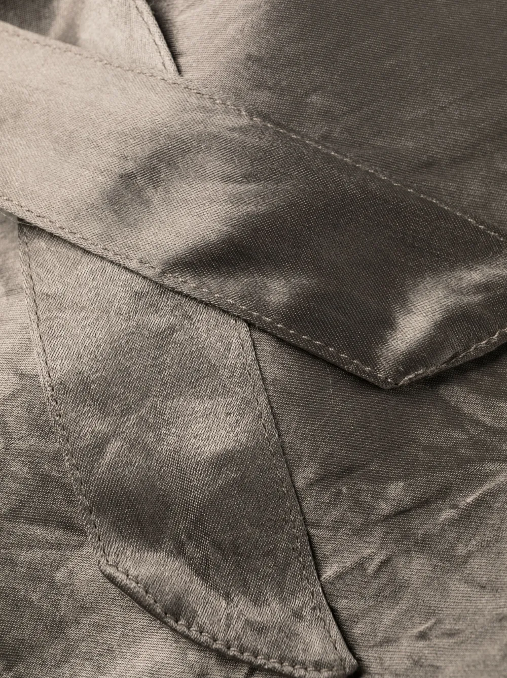 Anthracite, fini satiné, effet froissé, taille mi-haute, lien de resserrage à la taille, coupe ample.