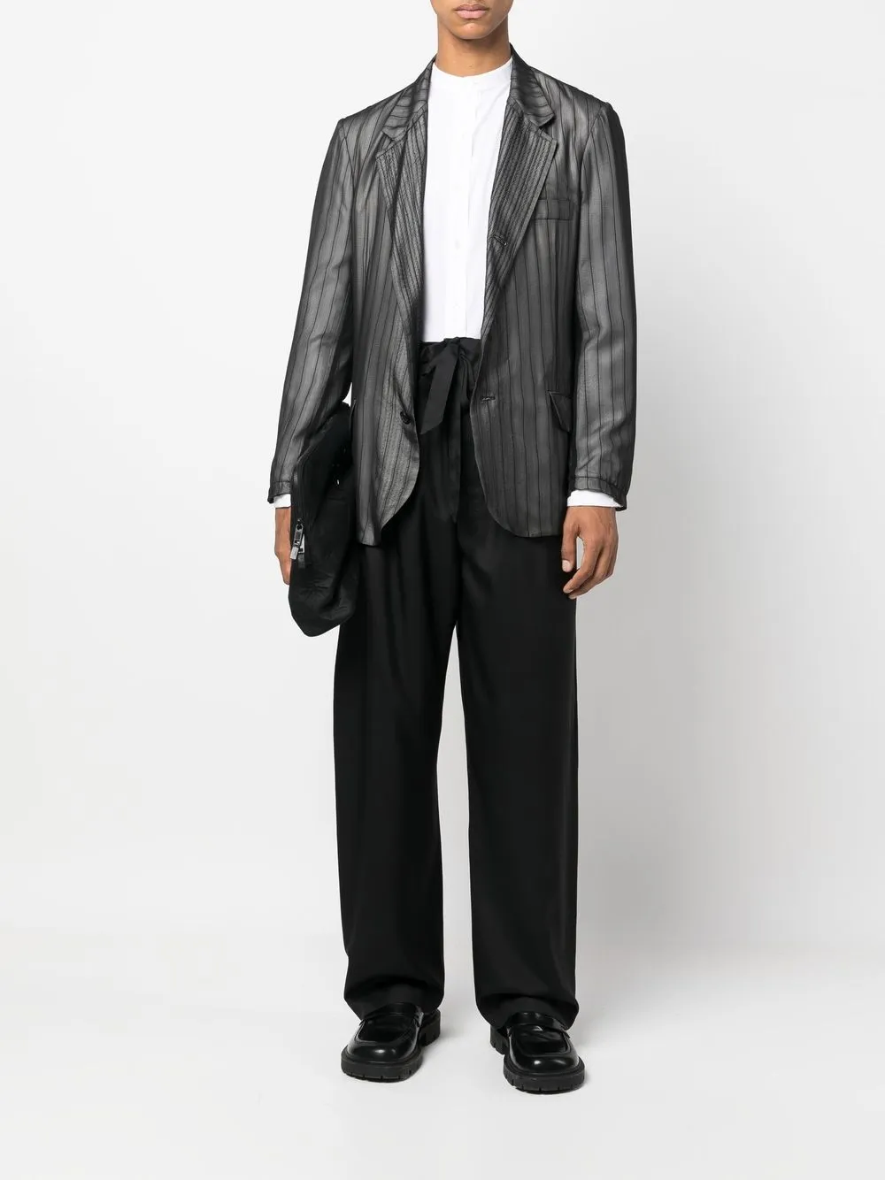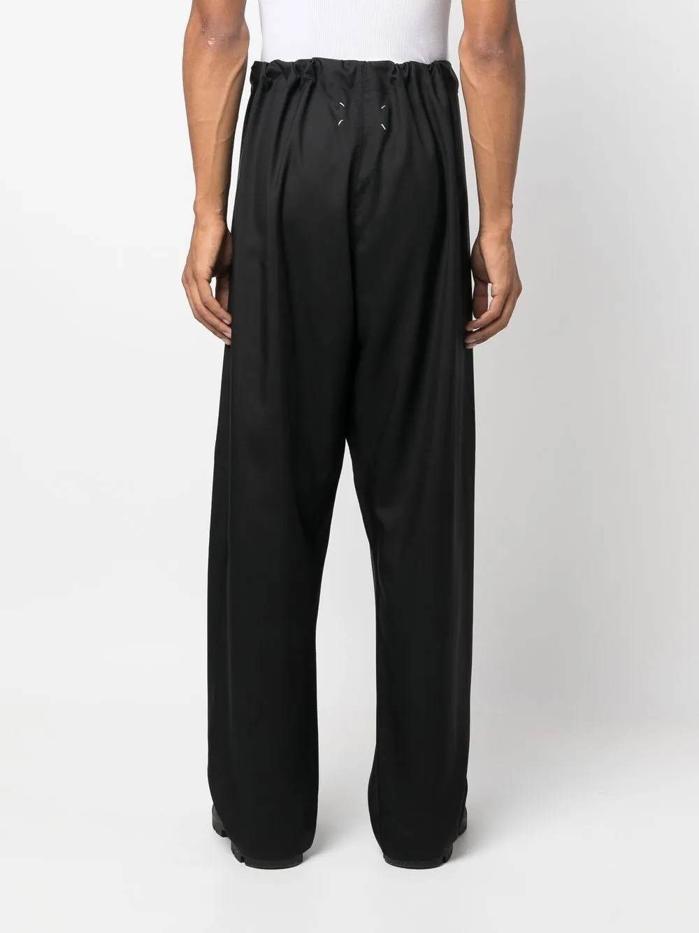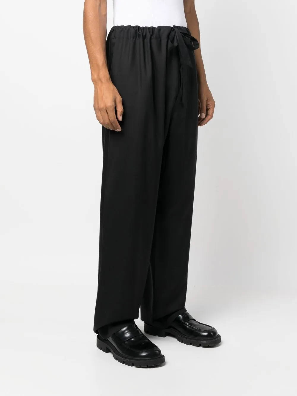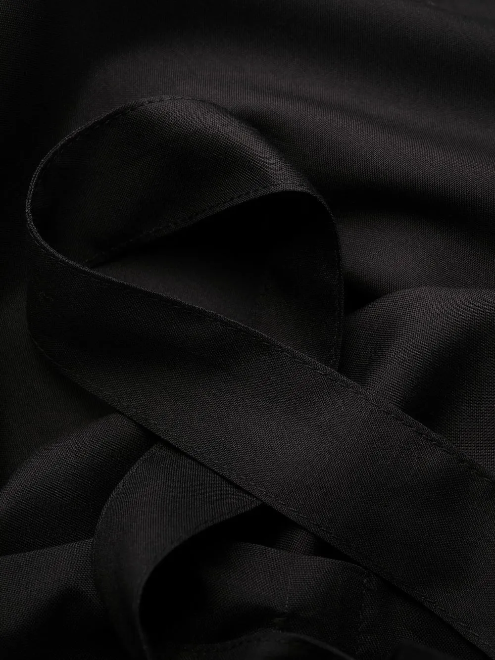Noir de jais, soie, taille haute, taille nouée, coupe ample.