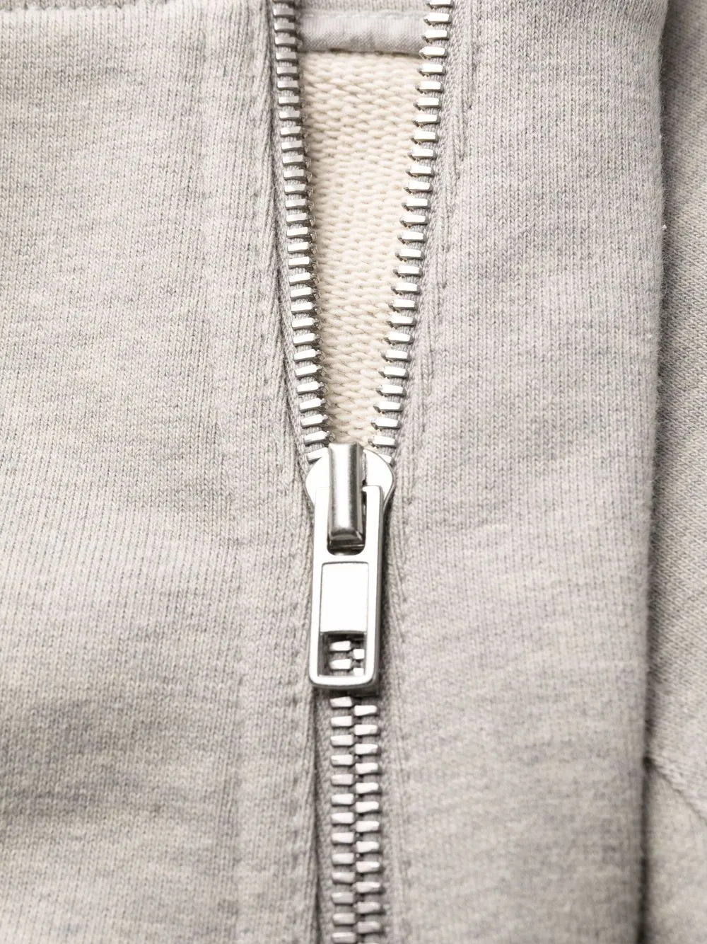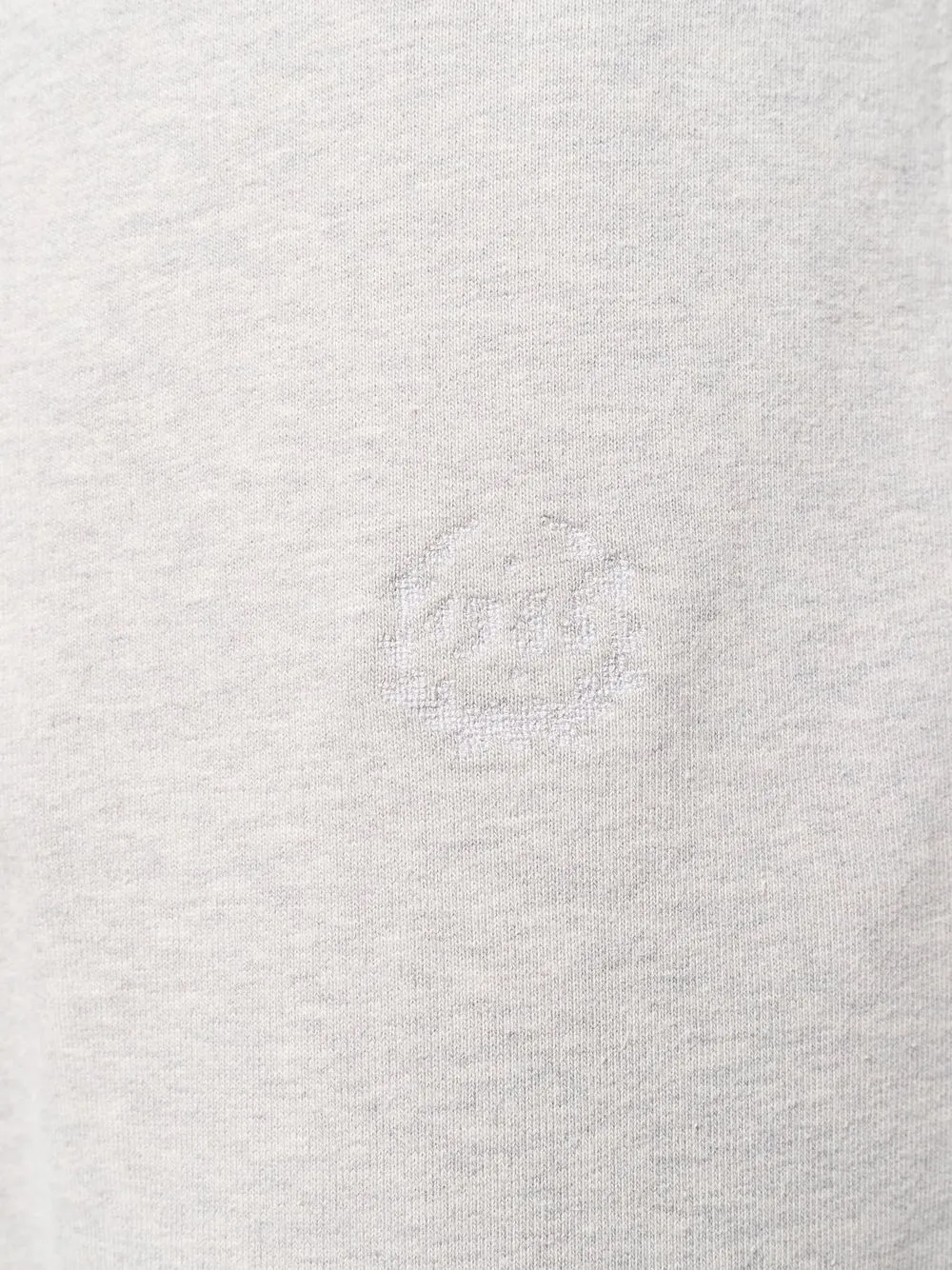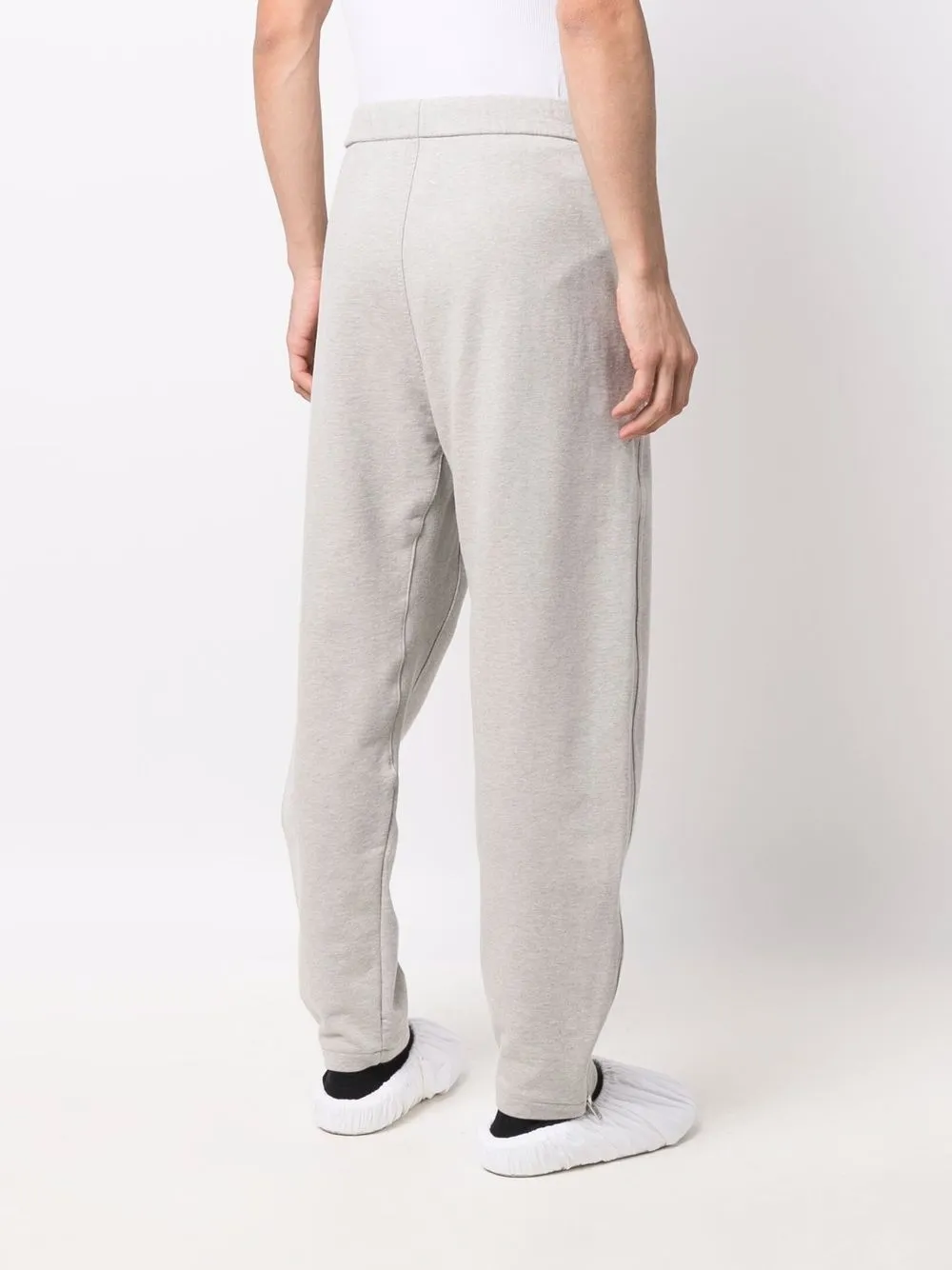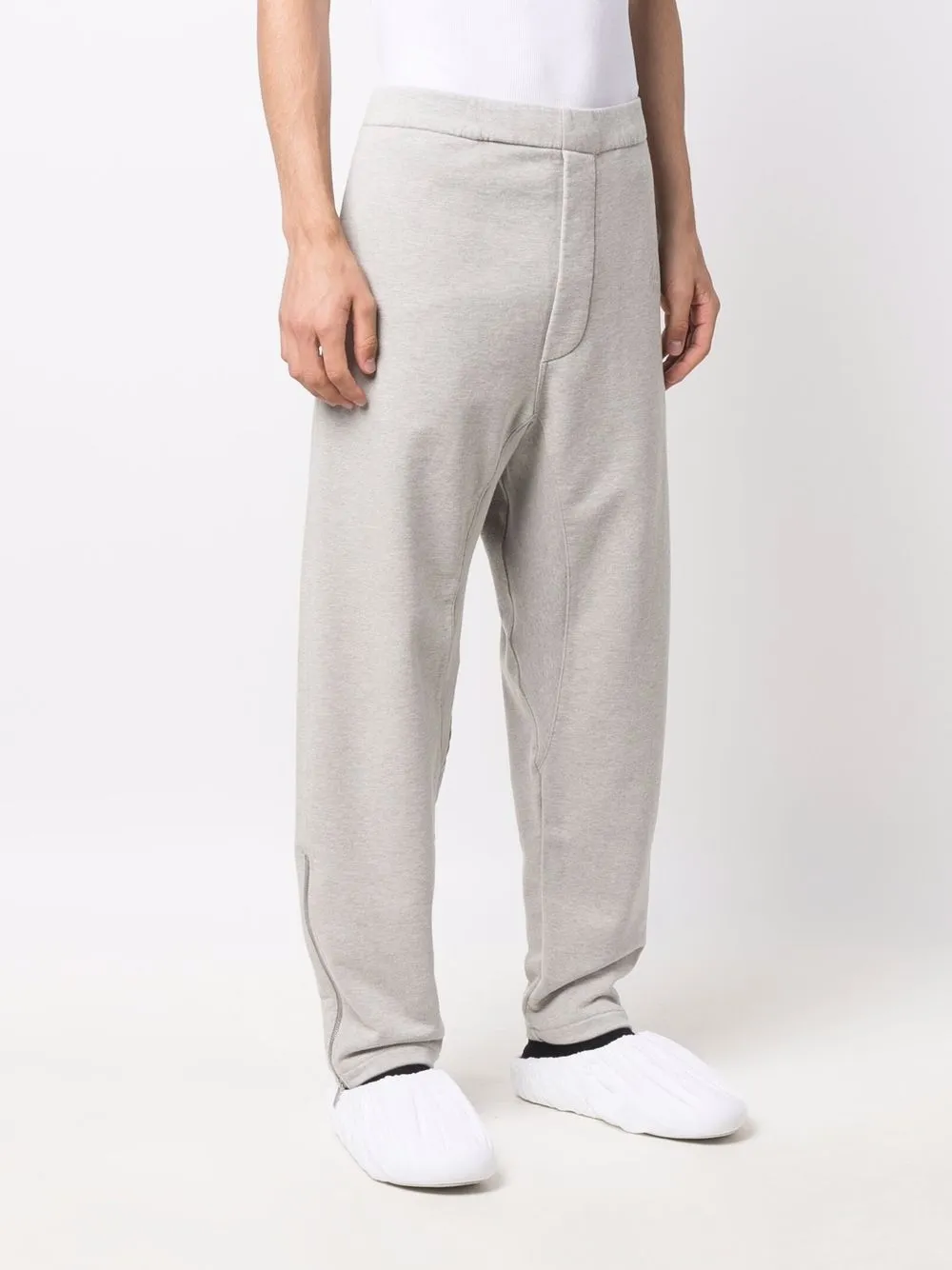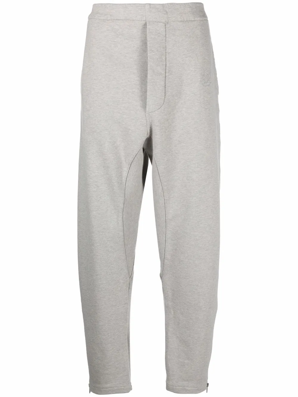 Fermeture à zip et agrafes, deux poches latérales fendues, logo embossé sur le devant, entrejambe sarouel. Couleur : gris. Matière : coton.