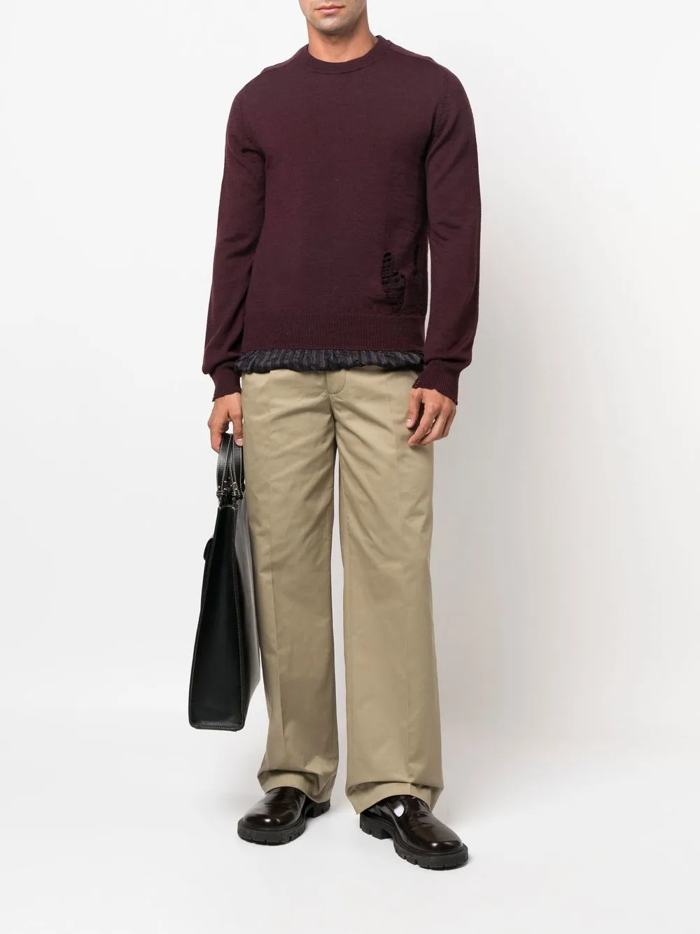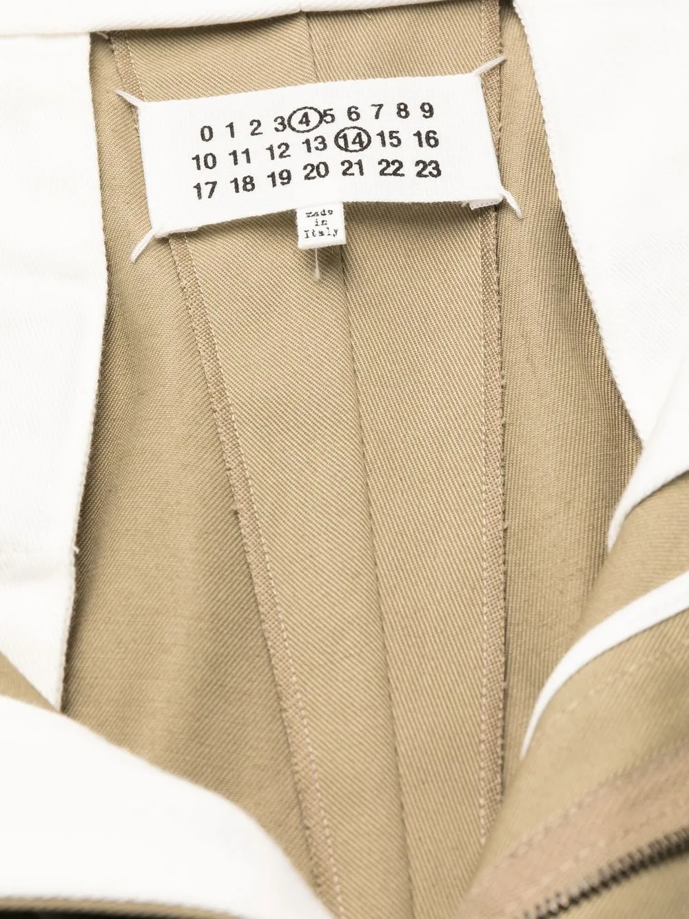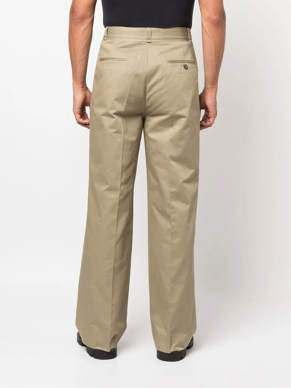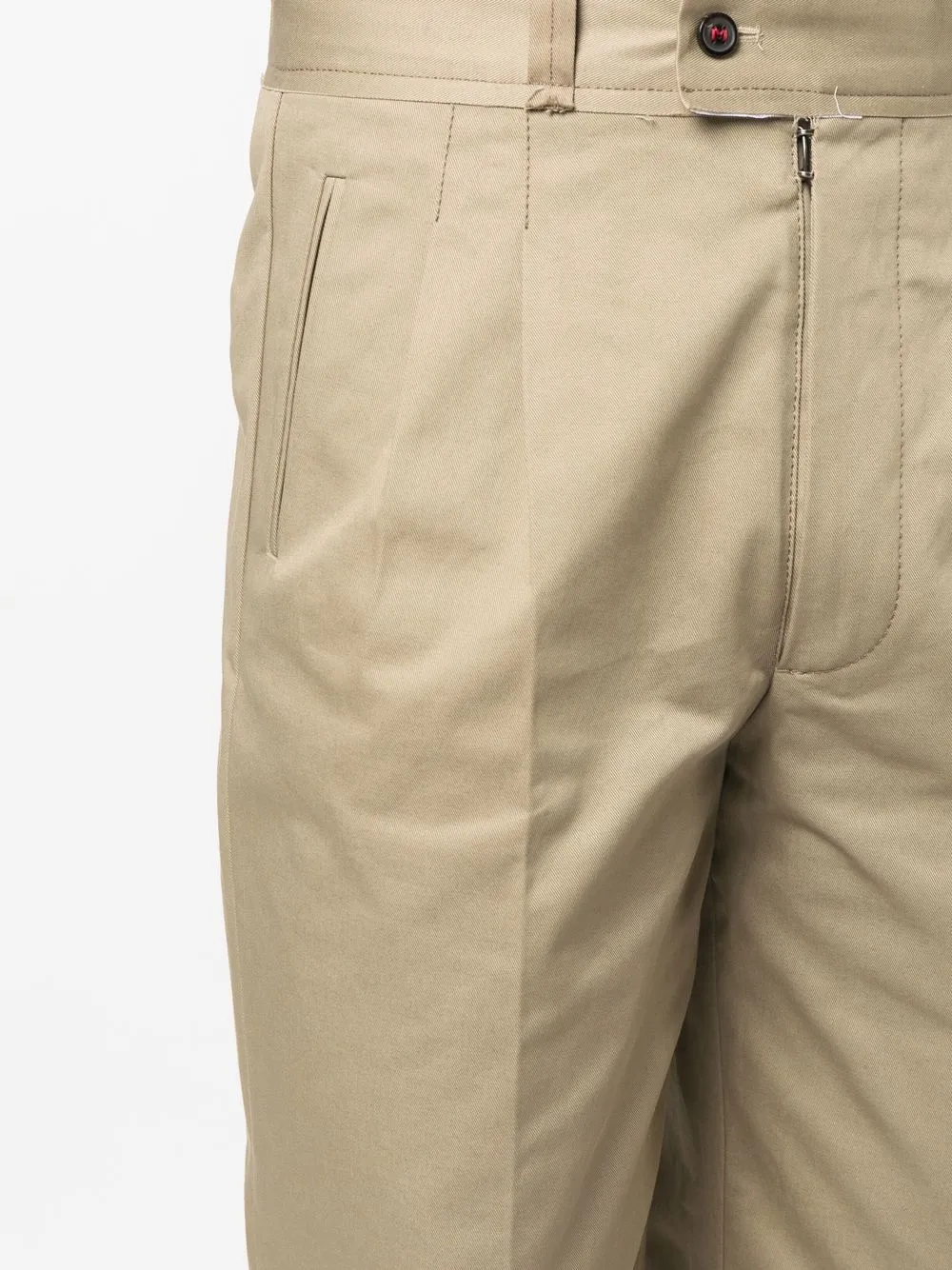 Beige sable, coton, passants de ceinture, fermeture à zip et boutons sur le devant, deux poches latérales fendues, poches arrière passepoilées, coupe droite.