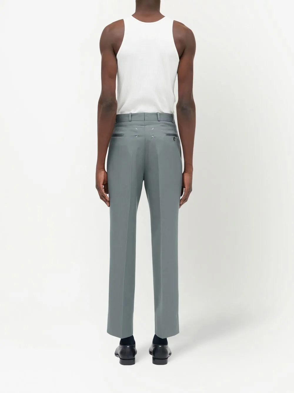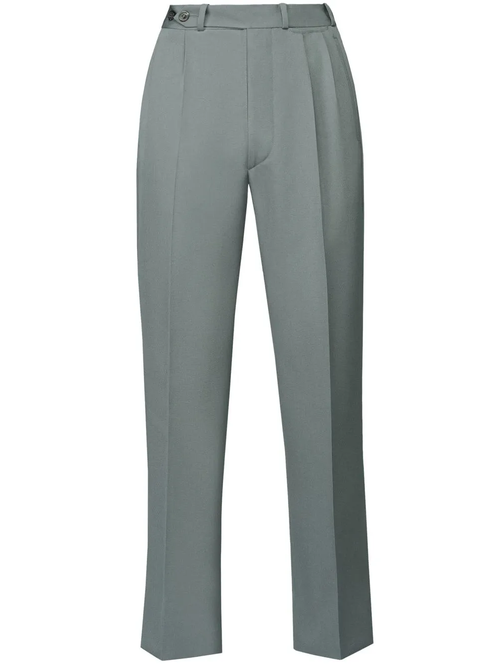 Bleu, laine vierge, fermeture décalée sur le devant, passants de ceinture, coupe fuselée, deux poches latérales fendues, poches arrière passepoilées.